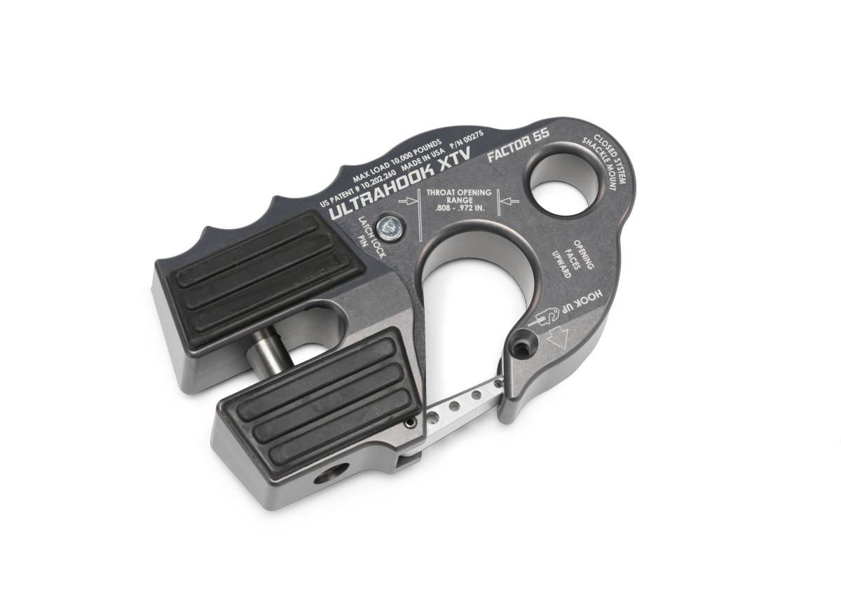 Low-profile Ultrahook XTV was developed to meet the needs of off-road racers who needed the speed of a hook and the functionality of closed system winching. Featuring industry-first closed system shackle mount hole machined into the body of the hook. The safety latch fits securely into a machined pocket and has an integrated secondary locking feature. The latch locking pin is stored in the body of the UltraHook XTV and can be inserted into the hook tip, locking the latch into place. Featuring EPDM rubber pads for fairlead protection, titanium double shear pin, and a finger grip feature that promotes proper ?Hook-Up? orientation.