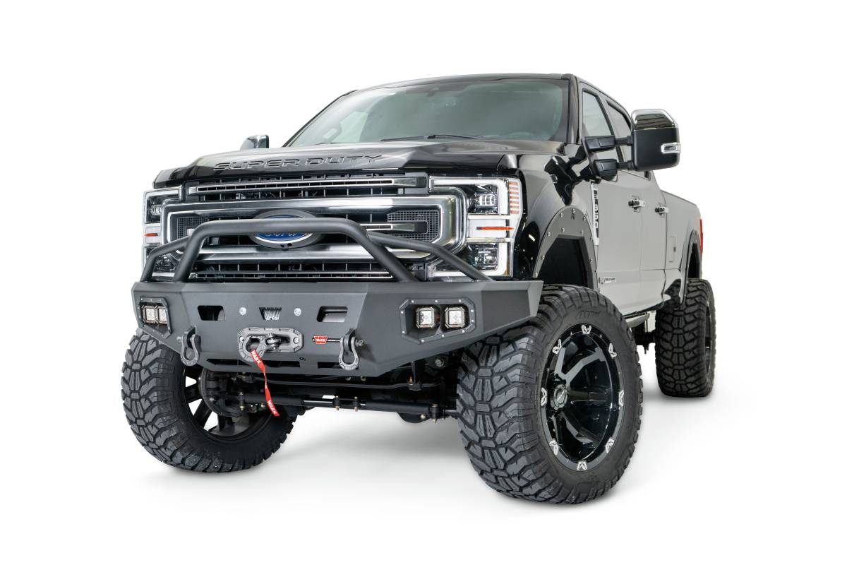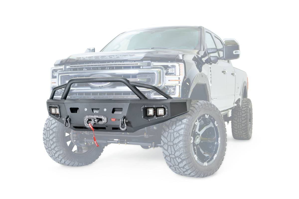 Ascent HD Bumper Ford F-250/350 with Prerunner GuardWARN Ascent HD front bumper for Ford F250/350 featuring a pre-runner style grille guard and integrated winch mount that will accept large or mid-frame winches up to 18,000 lbs in capacity.