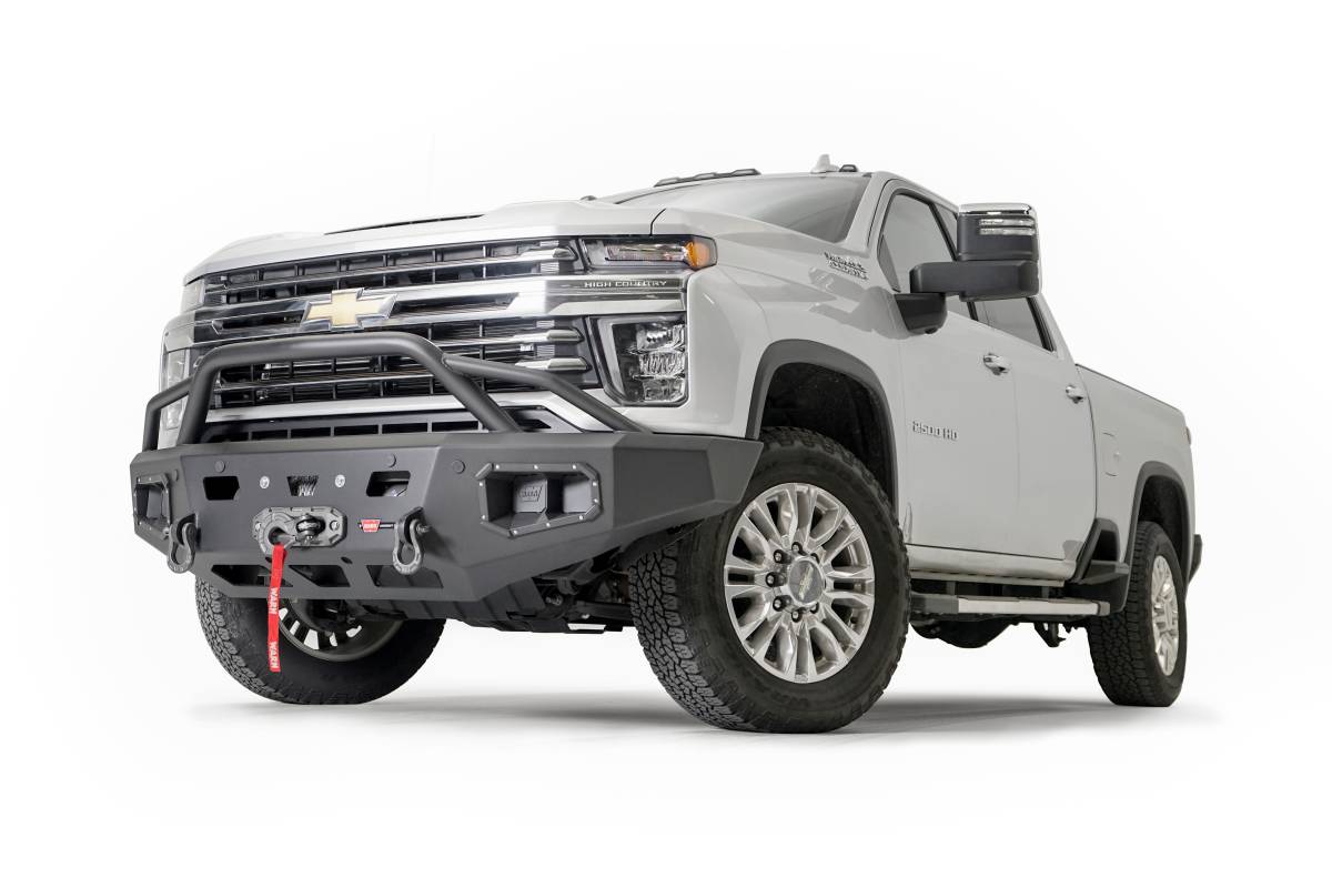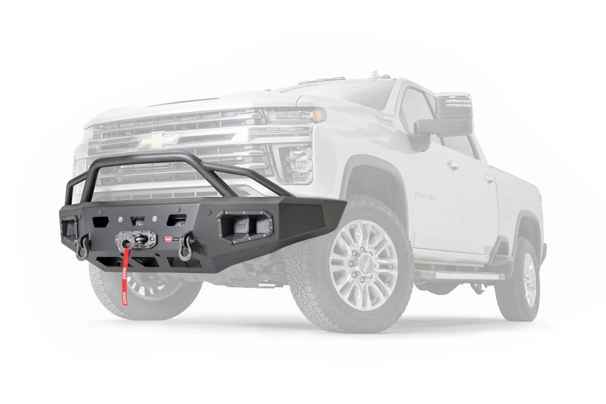 ASCENT HD BUMPER CHEVY 2500/3500 WITH PRERUNNER GUARDWARN Ascent HD front bumper for CHEVY 2500/3500 featuring a pre-runner style grille guard and integrated winch mount that will accept large or mid-frame winches up to 18,000 lbs in capacity.