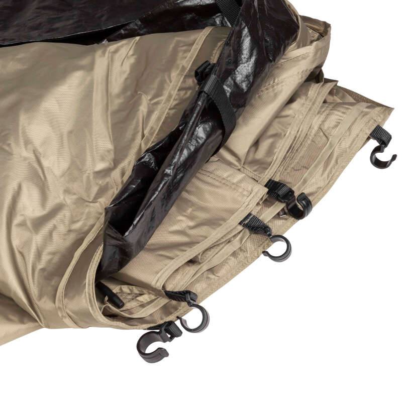 The Deluxe Awning room features a durable waterproof floor and its own separate ceiling, enhancing insulation from the sun. All 4-wall panels incorporate zipper operated access doors. The rear wall, located towards the vehicle, can be unzipped to provide access to the vehicle. The mesh pocket organize can be located on the right or left of the rear panel to house your magazines or personal items, helping everything have its place. Two zippered ports located in the top corners allow for power cable access and power cord guides are incorporated into the roof corners to keep cables tidy and safe. The 3 exterior walls are dual layers, featuring solid external panels, which can be zipped closed for protection and privacy or rolled up to reveal the internal mesh panels. The D shaped front mesh panel can be fully opened to reveal the natural setting while the side mesh incorporates zippers in the middle and base to accommodate entry and exit of the room.