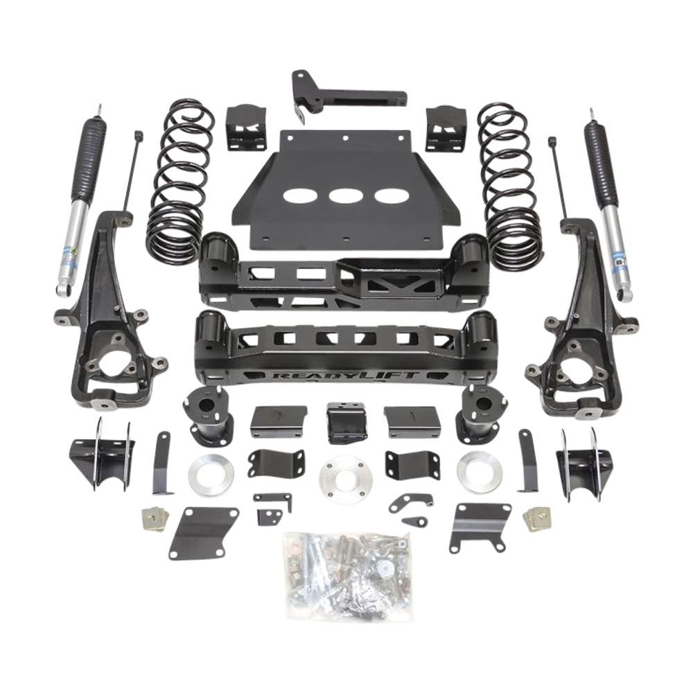 ReadyLIFT offers a 6 inch lift kit for 5th gen 2019-2023 Ram 1500 trucks that came factory with 22 inch wheels! After dedicated development and long-term testing, we are now shipping our Ram 1500 Big Lift Kit for the Ram customer seeking unmatched performance, style and durability. The all-new 44-1961 6" lift kit is a great option for 5th gen Ram 1500 owners who want a great riding tall stance capable of accepting 37" tall tires. Our engineers are delighted with the development of this kit and its many great features that make it the best 6" lift kit on the market! The 44-1961 lift kit includes many great features like rear Bilstein 5100 shocks, dual-rate rear coil springs and rear control arm brackets which combine to better capture small bump sensitivity and mid-stroke support. Laser-cut heavy-duty steel front cross members and differential drops retain factory geometry while providing proper differential rotation to ensure there is no driveline vibration when in 4WD or Auto-4HI. This all-new Ram 1500 6" lift kit adopts all the important elements of a premium lift kit to ensure the truck rides and drives remarkably. Rear track bar bracket, Bilstein rear shocks, longer rear sway bar end links, heavy-duty cast iron knuckles, and even new thick steel skid plates are just a few of the ingredients contributing to an amazing driving experience on up to 37x12.50 tall tires on 9" wide wheels with 0 offset. (See tire details below). Note: This kit is for the RAM 1500 with factory 22" wheels and no air ride. Kit requires a larger bore knuckle assembly due to larger wheel bearing assembly. If installing this kit any Off-Road Group Package equipped truck, ReadyLIFT recommends foregoing the front preload spacer installation - the lifted vehicle will sit about 1/2" front high with the preload spacer installed or 3/8" low without the preload spacer. This kit is NOT compatible with (1) adjustable "air ride" suspension equipped models, (2) diesel engine applications, or (3) Ram TRX.