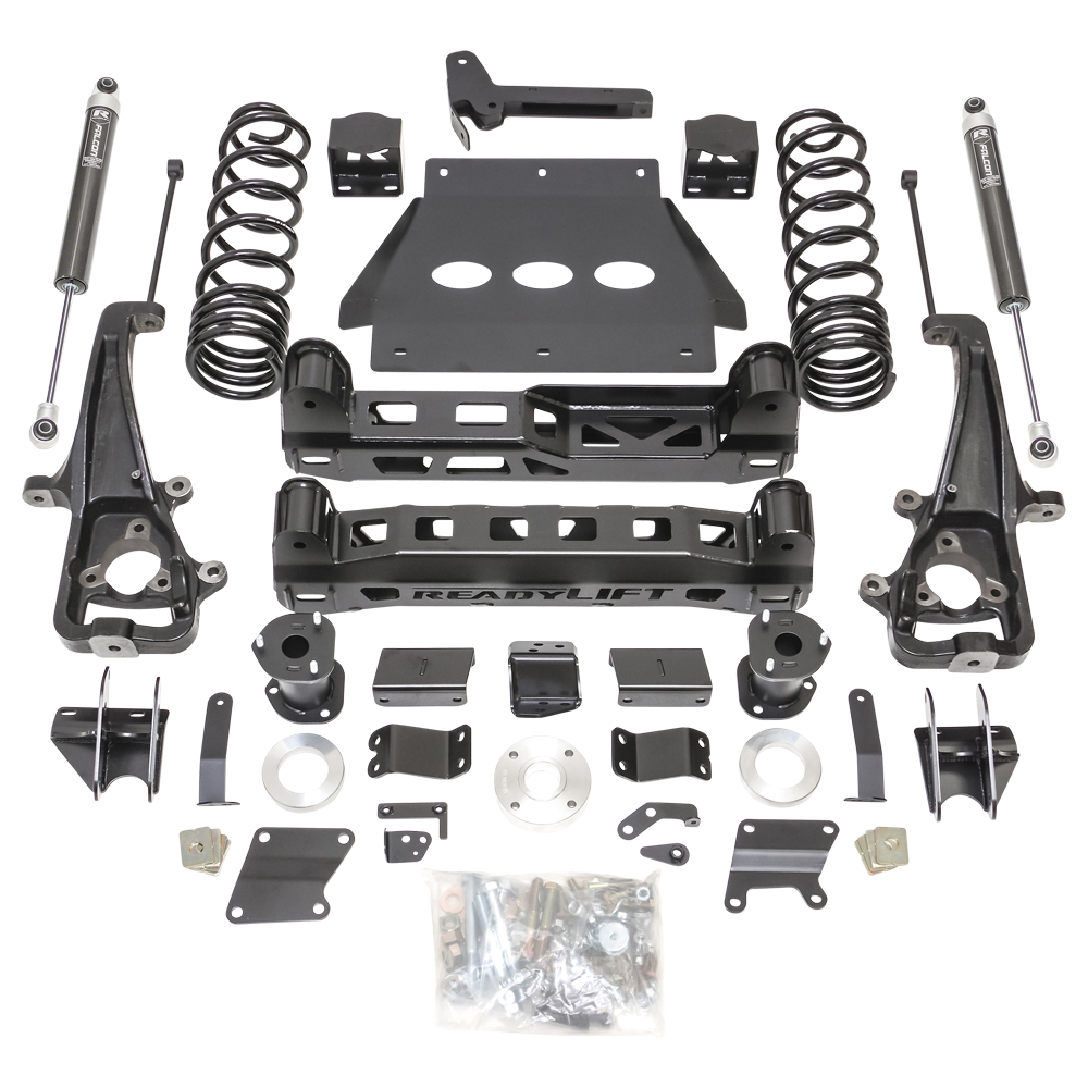 ReadyLIFT offers a 6 inch lift kit for 5th gen 2019-2023 Ram 1500 trucks that came factory with 22 inch wheels! After dedicated development and long-term testing, we are now shipping our Ram 1500 Big Lift Kit for the Ram customer seeking unmatched performance, style and durability. The all-new 44-19610 6" lift kit is a great option for 5th gen Ram 1500 owners who want a great riding tall stance capable of accepting 37" tall tires. Our engineers are delighted with the development of this kit and its many great features that make it the best 6" lift kit on the market! The 44-19610 lift kit includes many great features like rear Falcon 1.1 Mototube shocks, dual-rate rear coil springs and rear control arm brackets which combine to better capture small bump sensitivity and mid-stroke support. Laser-cut heavy-duty steel front cross members and differential drops retain factory geometry while providing proper differential rotation to ensure there is no driveline vibration when in 4WD or Auto-4HI. This all-new Ram 1500 6" lift kit adopts all the important elements of a premium lift kit to ensure the truck rides and drives remarkably. Rear track bar bracket, Falcon 1.1 Mototube rear shocks, longer rear sway bar end links, heavy-duty cast iron knuckles, and even new thick steel skid plates are just a few of the ingredients contributing to an amazing driving experience on up to 37x12.50 tall tires on 9" wide wheels with 0 offset. (See tire details below). Note: This kit is for the RAM 1500 with factory 22" wheels and no air ride. Kit requires a larger bore knuckle assembly due to larger wheel bearing assembly. If installing this kit any Off-Road Group Package equipped truck, ReadyLIFT recommends foregoing the front preload spacer installation - the lifted vehicle will sit about 1/2" front high with the preload spacer installed or 3/8" low without the preload spacer. This kit is NOT compatible with (1) adjustable "air ride" suspension equipped models, (2) diesel engine applications, or (3) Ram TRX.