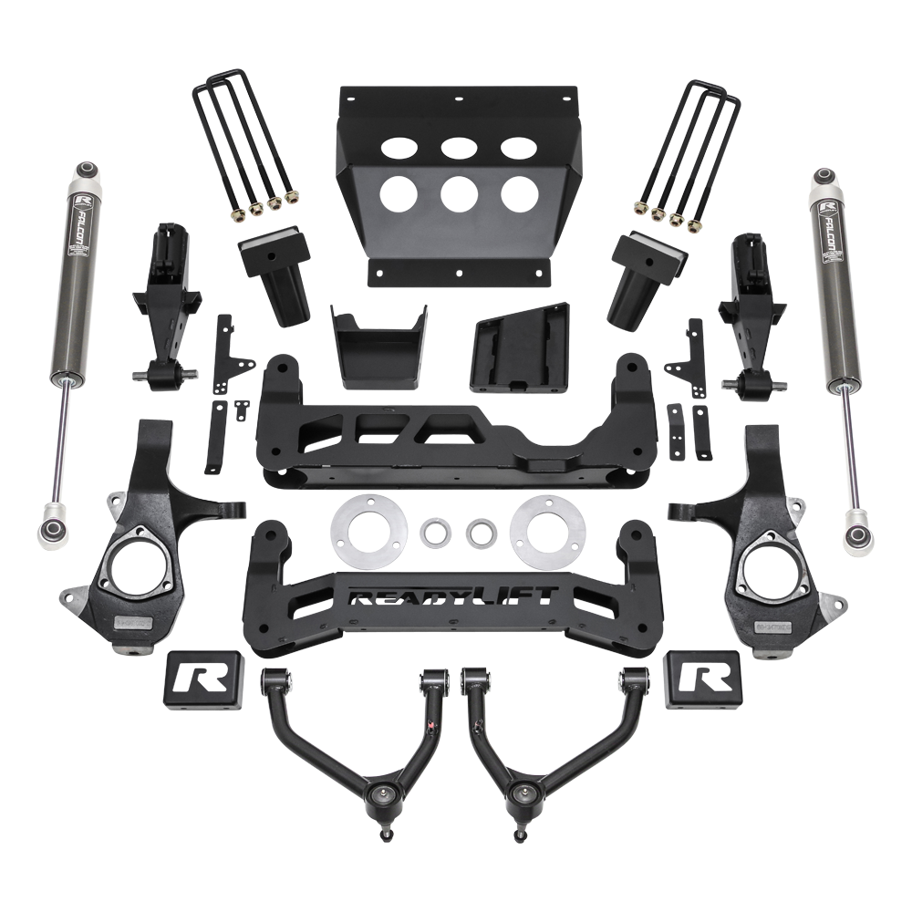 ReadyLIFT introduces an exciting 7-inch big lift kit for 2014-2018 Chevy Silverado and GMC Sierra 1500 trucks, compatible with or without MagneRide. The 44-34720 kit is designed for GM 1500 trucks equipped with factory Stamped Steel front suspension, featuring new tubular upper control arms. This innovative lift kit retains the factory turning radius while minimizing track width increase to less than 0.5" per side, allowing for up to a 35" tall tire on a 9-inch wide wheel with -12 offset. The "clam-shell" style lower strut extension keeps factory struts intact without requiring rotation, thanks to TCT lower bushings. The addition of proprietary tubular upper control arms with TCT pivot bushings ensures superior strength compared to OE stamped steel control arms. The kit includes boxed steel front/rear cross members and a full-width front skid plate made of 3/16" plate steel. It allows for the use of the OE front plastic gravel guard for engine bay protection and proper airflow. The lift is achieved with 1/4-inch boxed plate steel differential drop brackets featuring a double gusset and boxed center rib, designed to handle front differential torsional twisting. This kit is not for use on AWD applications, suitable for 2WD or 4WD only. Rear lift blocks are fabricated from 3/16-inch thick plate steel, including built-in bump stop landings and an offset pin design for axle centering and maintaining the proper pinion angle. The system comes with premium extended-length Falcon 1.1 Monotube rear shocks. Please note that it fits up to a 35" tall off-road tire, requiring a 9-inch wide wheel with -12 offset (tire tread variations may necessitate minor trimming). It is not recommended for GMC Denali 1500 with REAR MagneRide or other models with Rear MagneRide but is suitable for Front MagneRide. It can be used on trucks with a factory Aluminum front suspension and includes the ReadyLIFT ReadyGuard Powertrain Warranty.