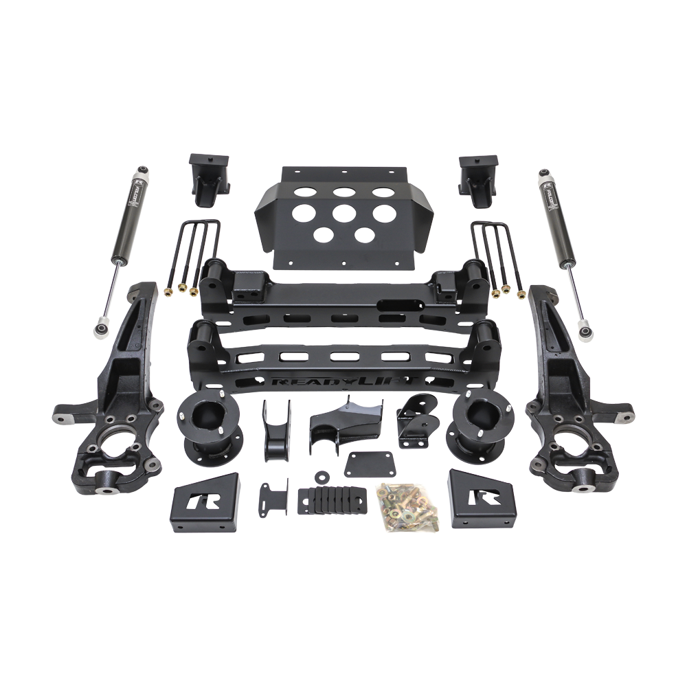 The ReadyLIFT 6" Big Lift Kit is designed for the 2019-2021 Chevy Silverado and GMC Sierra 1500 trucks, excluding Trail Boss, ZR2, or AT4 / AT4X models. This kit, with part number 44-39600, features advanced engineering for exceptional ride quality and handling. Its components include boxed steel front/rear cross members and a 3/16" thick steel front skid plate. The 1/4-inch steel differential drop brackets are double gusseted with a boxed center rib, ensuring durability against torsional twisting of the front differential. The kit's standout feature is its heavy-duty, angled, and offset top mount strut extensions that realign struts for optimal shock performance and minimal wear. A lower mount strut pre-load spacer increases spring rate for handling larger wheels and tires. The rear lift comprises 5" tall fabricated steel blocks with integrated bump stop landings and Falcon 1.1 Monotube rear shocks. After extensive testing, this kit is proven to enhance the ride of GM 1500 trucks. It allows for up to 35x12.50 tires on 20x9 wheels with 0 offset without trimming, and larger sizes with modifications. However, it's NOT compatible with Adaptive Ride Control, Multimatic systems, or trucks with rear composite mono-leaf springs (identifiable by round U-bolts); it works only with traditional steel leaf springs (square U-bolts). Key features include maintaining factory ride and handling, top mount strut extensions for factory geometry, 3/16-inch thick steel plate cross members and skid plate, anti-torsion differential drop brackets, fabricated steel rear lift blocks with bump stop landings, Falcon 1.1 Monotube rear shocks, and a ReadyGuard Powertrain Warranty. Note: Use of Auto 4 Hi is not recommended with this kit.