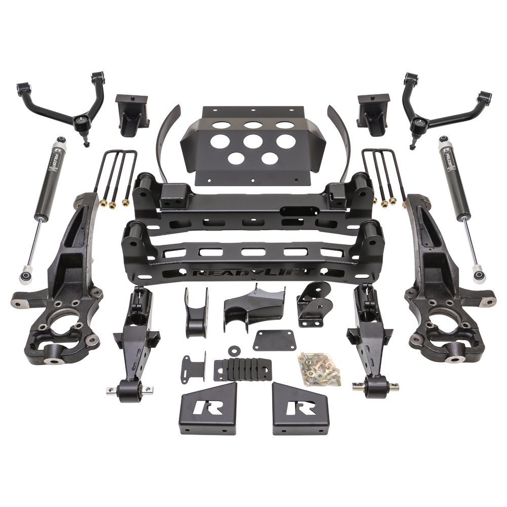 Introducing ReadyLIFT's innovative 8" Big Lift Kit designed specifically for the 2019-2021 MY Chevy Silverado and GMC Sierra 1500 trucks. This kit is engineered to provide exceptional ride quality and superior handling performance. Please note that it is not compatible with Trail Boss, AT4, AT4X, ZR2, or Denali models, as well as vehicles equipped with Adaptive Ride Control or Multimatic ¾ suspension or rear composite mono-leaf springs. The kit includes boxed steel front/rear cross members, a full-width front skid plate made of thick 3/16" plate steel, and 1/4-inch boxed plate steel differential drop brackets with double gussets and boxed center ribs to handle front differential torsional twisting. The lower strut extension, in a unique "clam-shell" style, retains the factory struts without requiring rotation and maintains the factory ride with TCT lower bushings. The kit also features proprietary tubular upper control arms with TCT pivot bushings for increased strength compared to OE stamped steel control arms. To lift the rear, fabricated steel rear blocks, an add-a-leaf, and Falcon 1.1 Monotube rear shocks are included. After nine months of rigorous engineering and testing, this Big Lift Kit proves to enhance the ride quality of these GM 1500 trucks significantly. It accommodates up to 37x12.50 tires on 8-inch kits with 9" wide wheels and 0 offset, with minor trimming required for -18 offset. The kit maintains factory ride and handling, offers increased tire size clearance, features maintenance-free pivot bushings, heavy-duty steel components, and includes the ReadyGuard Powertrain Warranty, making it the ultimate choice for lifting your 2019-2021 GM 1500 4WD truck.