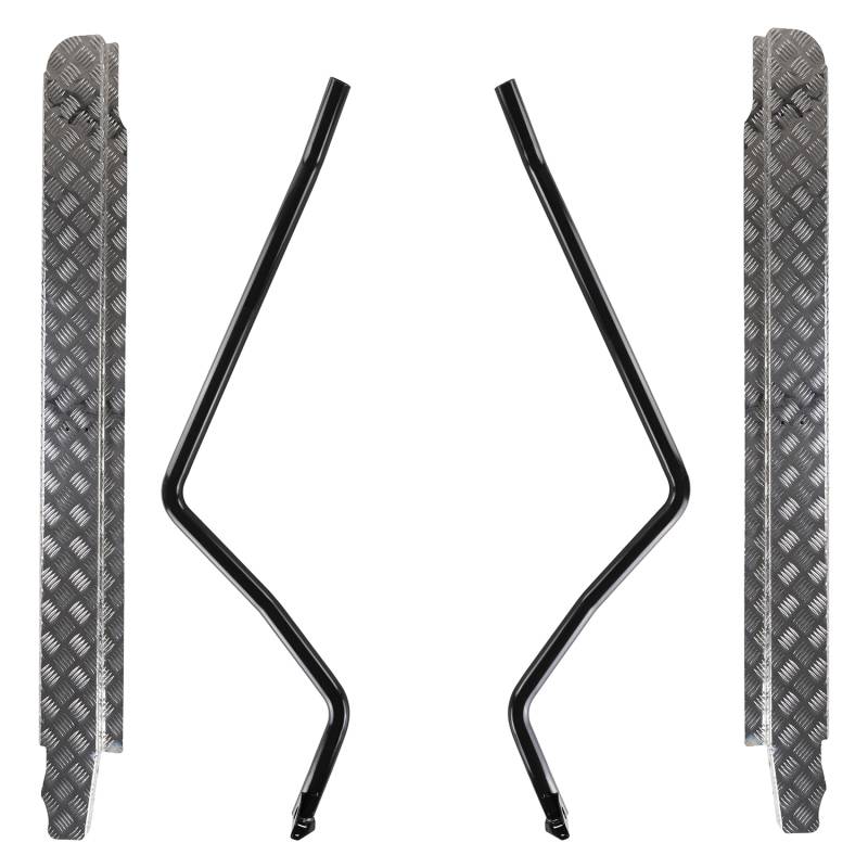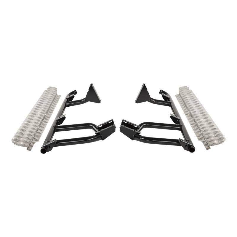 Side rail and combination steps to protect the front quarter panels and lower sills. The integrated step offers improved vehicle access. While they offer an excellent barrier against rock ledges, they are not considered a true rock slider that might be required for aggressive rock crawling.