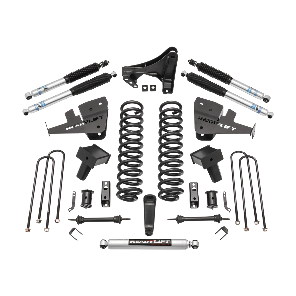 ReadyLIFT offers a 6.5" Lift Kit system made to fit 2017-2022 F250 Ford Super Duty 4WD trucks with a 2-piece drive shaft that includes premium Bilstein 5100 series shocks. This 6.5" lift kit gives owners an excellent lift kit option that will raise F250 trucks a total of 6.5" in front. Install up to 38" tall off road tires with no problems. This new complete lift kit delivers uncompromised ride and handling performance! The 49-2763 6.5" Lift Kit includes custom wound coil springs engineered to provide an incredibly great ride while also enhancing off-road driving performance. The kit includes radius arm drop brackets that allows you to use your factory radius arms and corrects caster in the process. To lift the rear we include OEM style cast iron rear lift blocks to bring the rear up level with the front while providing a factory-like ride. Other great components to this kit include a drop pitman arm, track bar bracket, sway bar end links, drive shaft spacer, and all hardware is included. NOTE: For use with 2-piece drive shafts only. NOTE: The lift blocks in this kit are not designed to work with aftermarket or factory add-on air spring/load leveling kits that attach to the bump stop tangs. Use of this type of air bag system will void all block warranties and can cause failure of the block bump stop tang. NOTE: Diesel engines only. NOTE: Kit includes four (4) Bilstein 5100 shocks. Features & Benefits: Maximum wheel and tire size 22 x 12 with +12 offset with 38x13.50" tire 6.5" of front lift for additional ground clearance and ability to clear up to 38" tires. Radius arm drop brackets allow you to use your factory radius arms and corrects caster. Custom wound coil springs for maximum off road and on road performance. 6.5" lift rear blocks provides comfortable lift while maintaining a quality ride. Includes extended sway bar end links, bump stop extensions, alignment cams, drop pitman arm and extended brake line brackets.