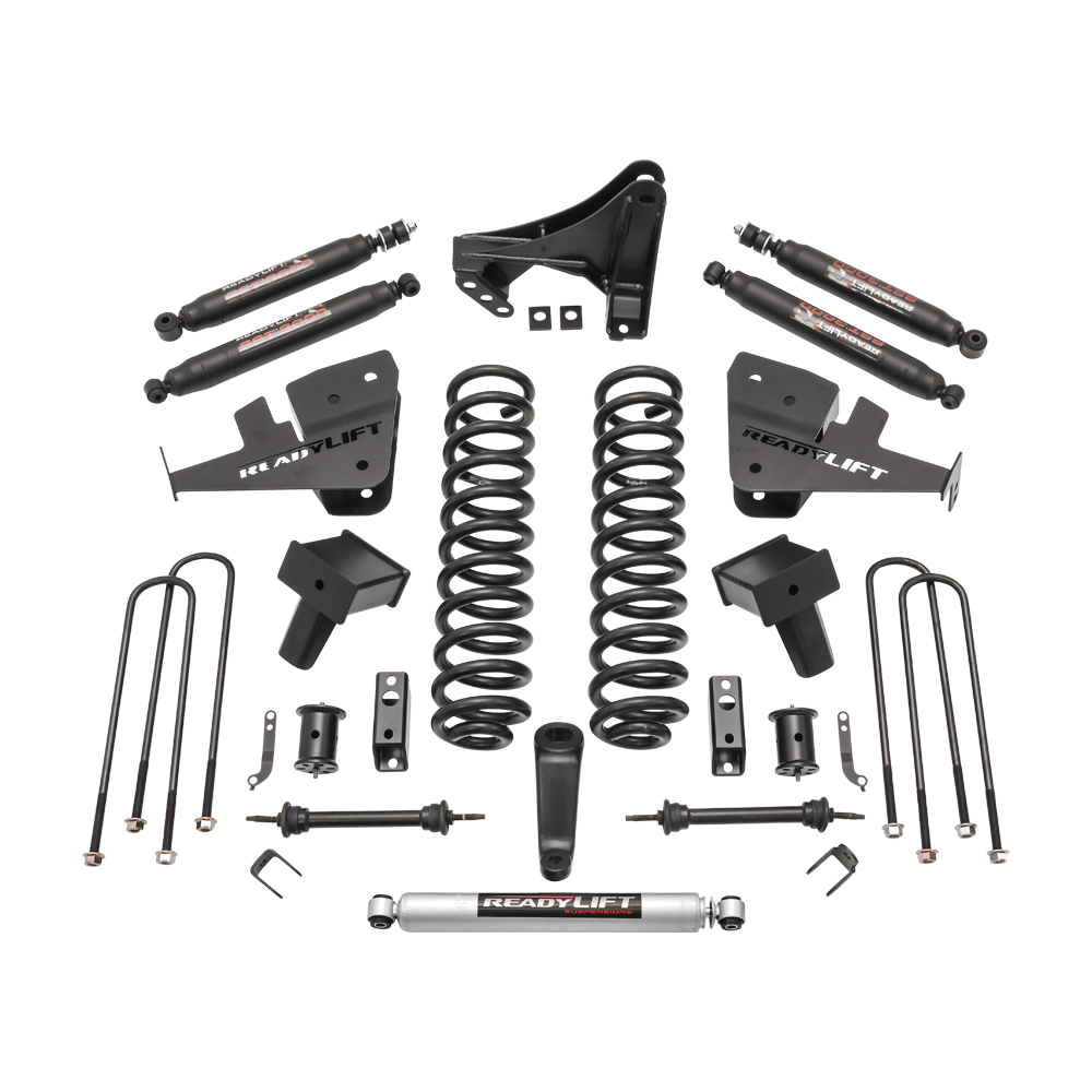 ReadyLIFT offers a 6.5" Lift Kit system made to fit 2017-2022 F250 Ford Super Duty 4WD trucks with a one-piece drive shaft that includes our SST3000 shocks. This 6.5" lift kit gives owners an excellent lift kit option that will raise F250 trucks a total of 6.5" in front. Install up to 38" tall off road tires with no problems. This new complete lift kit delivers uncompromised ride and handling performance! The 49-2767 6.5" Lift Kit includes custom wound coil springs engineered to provide an incredibly great ride while also enhancing off-road driving performance. The kit includes radius arm drop brackets that allows you to use your factory radius arms and corrects caster in the process. To lift the rear we include OEM style cast iron rear lift blocks to bring the rear up level with the front while providing a factory-like ride. Other great components to this kit include a drop pitman arm, track bar bracket, sway bar end links, drive shaft spacer, and all hardware is included. NOTE: For use with 1-piece drive shafts only. NOTE:The lift blocks in this kit are not designed to work with aftermarket or factory add-on air spring/load leveling kits that attach to the bump stop tangs. Use of this type of air bag system will void all block warranties and can cause failure of the block bump stop tang. NOTE: Diesel engines only. NOTE: Kit includes four (4) SST3000 shocks. Features & Benefits: Maximum wheel and tire size 22 x 12 with +12 offset with 38x13.50" tire 6.5" of front lift for additional ground clearance and ability to clear up to 38" tires. Radius arm drop brackets allow you to use your factory radius arms and corrects caster. Custom wound coil springs for maximum off road and on road performance. 5" lift rear blocks and add-a-leaf provides comfortable lift while maintaining a quality ride. Includes extended sway bar end links, bump stop extensions, alignment cams, drop pitman arm and extended brake line brackets.
