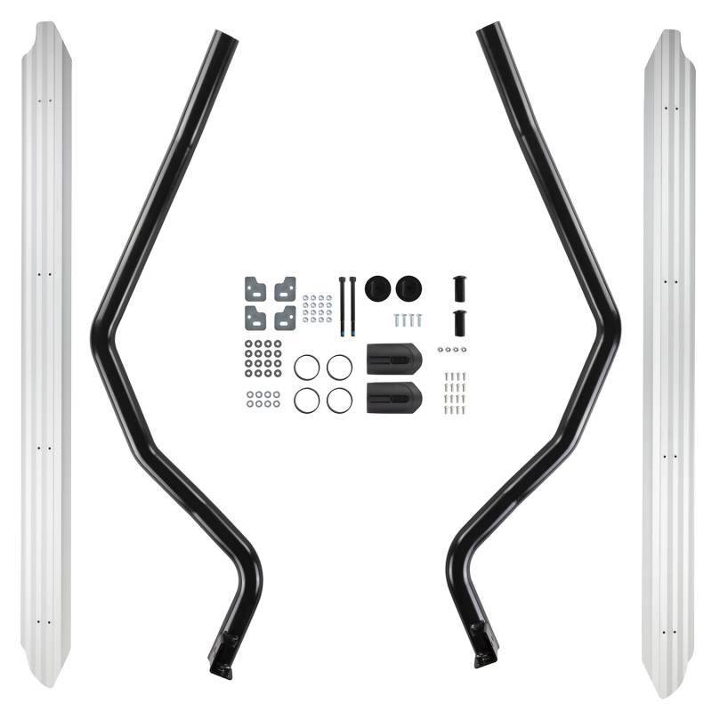 Side rail and combination steps to protect the front quarter panels and lower sills. The integrated step offers improved vehicle access. While they offer an excellent barrier against rock ledges, they are not considered a true rock slider that might be required for aggressive rock crawling.