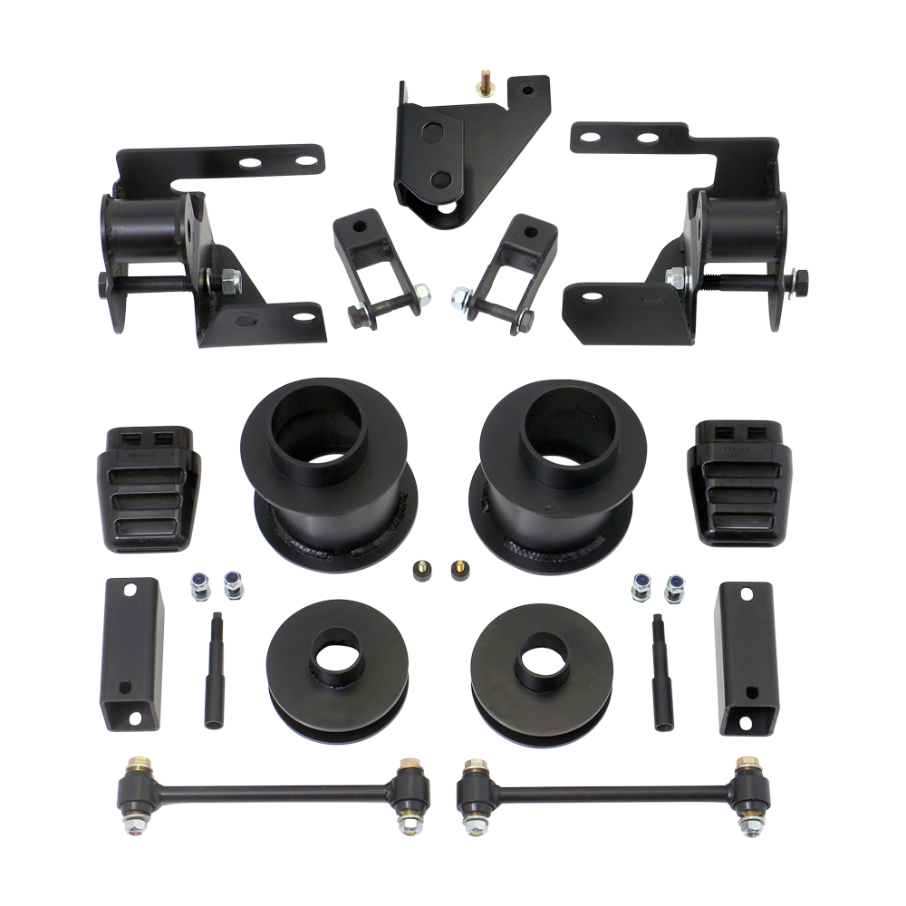 ReadyLIFT Dodge Ram SST Lift Kits are the fastest, safest, least expensive way to lift your 2014-2018 Dodge Ram 2500 4WD truck without compromising the factory ride or handling. Made with durable black e-coated steel, ReadyLIFT 4.5'' SST Lift coil spacers will not deteriorate or decrease ride height over time and allow you to retain the use of your factory front coil spring. ReadyLIFT provides a great bolt-on lift solution for getting maximum bolt on lift suitable for running negative offset wheels with up to a 37" tall tire. The 69-1242 4.5" SST Lift Kit provides 4.5" of front lift and 2.5" of rear lift with heavy-duty fabricated steel coil spring spacers. This kit includes necessary front radius arm drop brackets and replacement front track bar relocation bracket to ensure perfect suspension geometry to maintain that factory ride. Kit also includes front/rear shock extensions, bump stop extensions, longer sway bar end links and front sway bar frame side spacers. 69-1242 is a great no-modifications required lift kit that will get your new 2014-18 Ram 2500 HD 4WD up nice and high while keeping the factory ride and handling characteristics. Not for use with Power Wagon or snow prep package or ambulance package equipped vehicles.