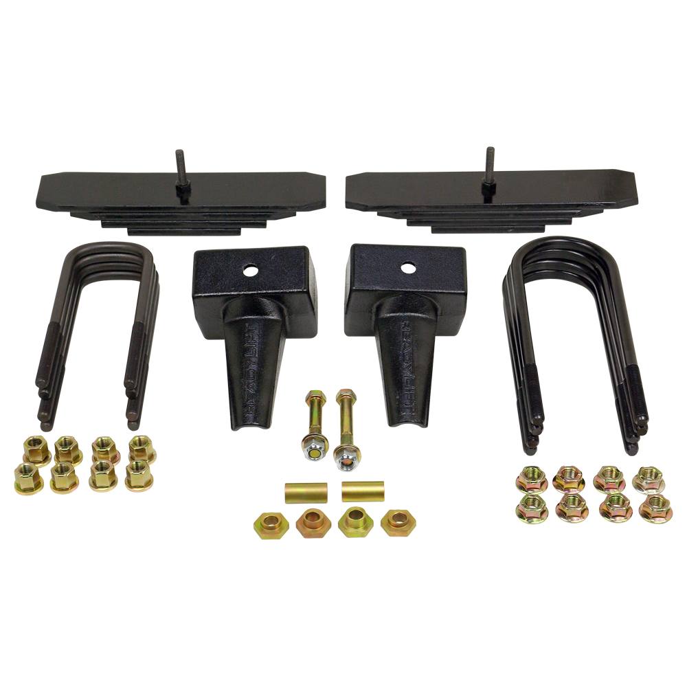 ReadyLIFT offers an expanded line of leveling products made to fit the Ford Super Duty trucks. Due to popular demand we developed a SST Lift Kit for the 1999-2004 Ford F250 Super Duty 4WD trucks and 2000-2005 Ford Excursion 4WD. (Note: for use on 1999 model F250 trucks built after 3/1/1999 - not for use on trucks built before 3/1/99). These front leaf spring trucks require an innovative approach to leveling-lifting. ReadyLIFT is proud to offer a new SST Lift Kit system that will compliment the leaf spring suspension. This system includes a "mini leaf pack" that, once installed under the factory leaf spring pack, raises the front of the F250 4WD Super Duty trucks a total of 2.0" which is what is required to obtain a level stance. To lift the rear, our time-tested OEM-style 4.0" cast iron rear blocks with built-in pinion angle correction and bump stop landings replace the factory 2.0" block for additional lift of 2.0". This kit also includes a carrier bearing spacer which is intended for use on trucks with a two-piece drive shaft. This set up establishes a mild lift with a slight rake maintained for towing or hauling. The kit comes with new longer front and rear U-bolts and hardware as well as important pan-hard bar alignment bushings. This kit will allow for up to 35" tall tires. If you are looking for a leveling kit for your (post 3/1/99) '99-04 F250 then look no further. This is the kit you've been searching for. Fits trucks fit with either the gas or diesel engine applications. NOTE: For trucks with a one-piece drive shaft. NOTE: The lift blocks in this kit are not designed to work with aftermarket or factory add-on air spring/load leveling kits that attach to the bump stop tangs. Use of this type of air bag system will void all block warranties and can cause failure of the block bump stop tang.