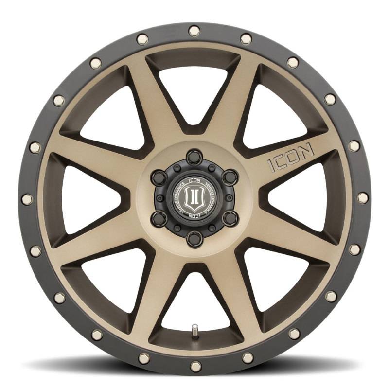 Constructed using a high-strength aluminum alloy the 20” 'Rebound' yields a 2,750 pound load rating that will withstand daily driven use, tow/haul duty, and spirited off-road adventures! These wheels are available in our signature Bronze, Satin Black or Titanium finishes and maintain ICON Alloys’ commitment to producing wheels that deliver on fit, style, and strength. Constructed using a high-strength aluminum alloy the 20” 'Rebound' yields a 2,750 pound load rating that will withstand daily driven use, tow/haul duty, and spirited off-road adventures! These wheels are available in our signature Bronze, Satin Black, Double Black, or Titanium finishes and maintain ICON Alloys’ commitment to producing wheels that deliver on fit, style, and strength. ICON Alloys is pleased to announce the arrival of new 20" sizes of our best-selling 'Rebound' wheel designed for today’s most popular 5-lug and 6-lug applications. Combining sharp lines, a concave spoke design, and color-matched rock ring bolts the new 20x9 ‘Rebound’ has a style that is anything but ordinary. These new wheels not only enhance the appearance of the most common vehicles, but also improve function with "ICON-optimized" backspacing that provides better wheel fitment, maximized caliper clearance, reduced scrub radius, and unhindered suspension travel.