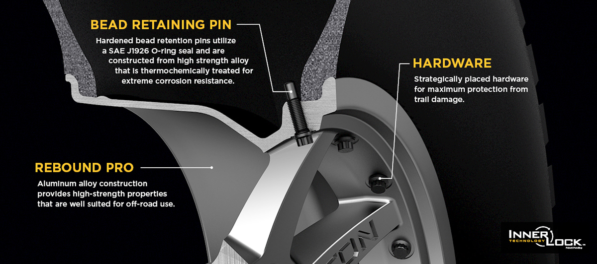 Any hardcore off-road enthusiast knows the numerous benefits that lower tire pressures offer such as improved ride quality and a larger contact patch for increased traction. However, low pressures also increase the risk of de-beading the tire during extreme side loads or aggressive driving. While traditional beadlock wheels address this issue by clamping the tire’s bead, they also need frequent maintenance, require specialty tools/parts, increase rotational mass, and are NOT legal for on-road use.;The ICON Alloys Rebound PRO with patented InnerLock technology offers the best of both worlds by using a robust bead retention system to keep the tire bead secured to the wheel while also being fully DOT compliant. This provides confidence in knowing that your wheels are prepared to tackle whatever situation you encounter - on or off the beaten path. InnerLock is ready for any type of terrain and every single adventure.;During an accelerated R&D process ICON engineers subjected the Rebound PRO to thousands of miles of real-world abuse throughout harsh and unforgiving environments. After on-vehicle testing was concluded, the Rebound PRO was sent to an independent contractor for precise lab testing, specifically the FMVSS No.139 Tire Bead Unseat Resistance Test (modified to 10 psi). Results from multiple tests validated the effectiveness of ICON’s InnerLock technology by exceeding the mechanical limits of the machine (over 7600lbs load) without ever de-beading the tire.;Staying true to the ICON Alloys approach, the Rebound PRO has been engineered to maximize caliper clearance and optimize wheel position for un-hindered suspension travel and steering function. Backspace and wheel offset dimensions have been strategically developed to reduce scrub radius, improving all-around handling and ride quality. The Rebound PRO has also been strength tested to yield a 3,200lb load rating - making it one of the strongest wheel options on the market. With build features such as these, it's clear that a set of ICON Alloys wheels is the perfect complement to any truck, Jeep, or SUV.