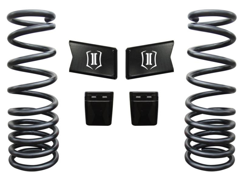 The ICON Vehicle Dynamics 2.5 inch Dual Rate Spring System for 2003 - 2012 Ram 2500 / 3500 4WD levels out your truck and offers you both incredible ride quality and performance. This 2.5 inch dual rate spring system offers an initial soft ride zone with an aggressive 2nd rate to help prevent bottoming out. These ICON springs have a dual stage powder coat process to help prevent corrosion and are shot peened and pre-set to prevent sagging. Also included are longer urethane bumpstops that have a more progressive bottom out, and sway bar drop brackets to compliment the additional travel. Front shocks are required for complete installation and we offer 2.0 Aluminum Series smooth body and Remote Reservoir, or our 2.5 Series Reservoir shock with or without CDC (compression damping control) Valve. All ICON shocks are engineered to be the correct length offering maximum droop and compression travel, then tuned to work hand in hand with these springs for the best available on and offroad performance.