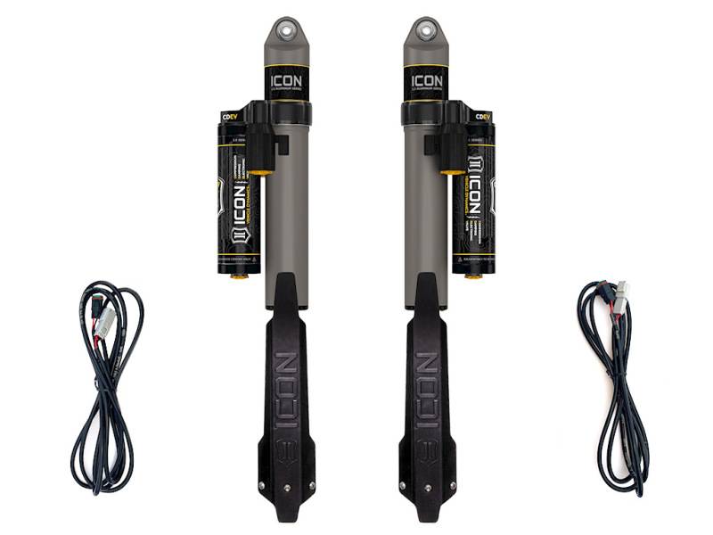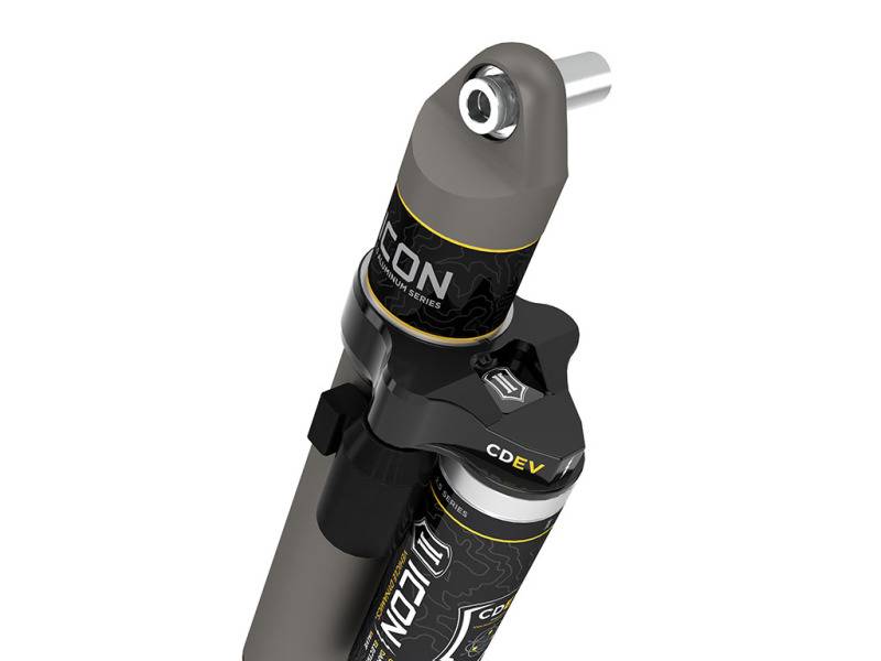 Compression Damping Electronic Valve (CDEV) is an electronically controlled valve that meters the flow of oil to regulate the amount of damping force that is created by the shock when compressed. This infinitely variable valve can react in less than 40ms and has the ability to make extremely precise adjustments for varying terrain. CDEV’s hydraulic circuits are also custom tailored per application to create the highest resolution and dynamic range allowable for each specific vehicle. Powered by ICON Intelligent Control and proprietary ICON mobile app, the system uses information from the onboard G-force sensor and Gyroscope to perform calculations based on algorithms and user-defined settings to predict terrain and adjust shock settings via the CDEV accordingly. ICON Vehicle Specific (V.S.) 2.5 Aluminum Series shocks with CDEV are designed and built to give your vehicle outstanding performance off-road and a smooth ride on the street. These shocks are configured specifically for each application in both length and damping tune. For piggyback and specific remote reservoir applications, ICON'S unique use of a 6061 billet aluminum manifold a few inches below the top cap of the shock creates an internal Bump Zone that when used creates an additional 20% of damping force. This additional force helps prevent harsh bottom outs and controls the suspension when compressing at high velocity. Like all ICON'S Shock Absorbers, V.S. 2.5 Aluminum Series shocks with CDEV are 100% rebuildable and 100% revalveable.