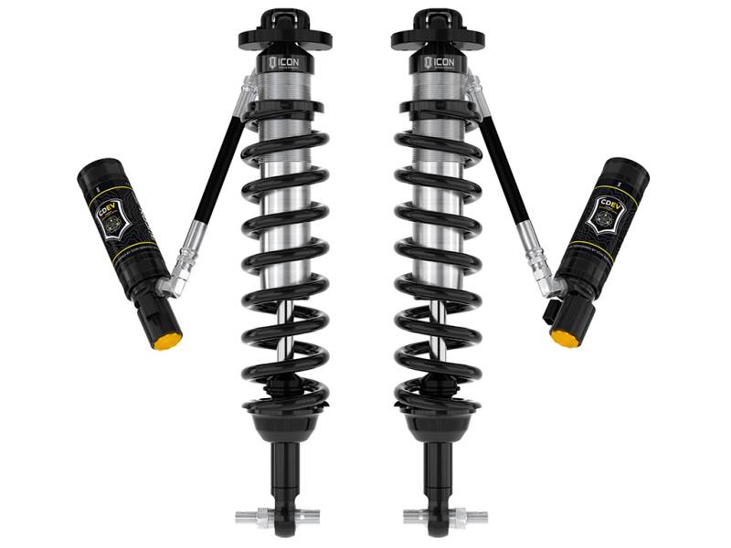 ICON Vehicle Dynamics V.S. 2.5 Series remote reservoir front coilover shocks with CDEV are the ideal upgrade for the front end of the 2021-2023 Ford Bronco. These adjustable coilovers allow up to 3-4” of lift height adjustability on Broncos without the Sasquatch package or 2-3” of lift over stock Sasquatch equipped Broncos, allowing the use of larger, more aggressive wheel and tire combinations. ICON’s Vehicle-specific shock length and valving along with the larger 2.5” shock body and increased piston area over stock components yield the maximum travel possible along with superior ride quality and suspension performance both on- and off-road. Reservoirs greatly increase shock oil volume and heat dissipation surface area to resist overheating and cavitation under hard use, which can lead to damper fade. ICON's exclusive Compression Damping Electronic Valves (CDEV) are included to allow for lightning fast, precise electronic shock tuning, on-the-fly, at any speed and in any terrain. Focus on driving and let ICON Intelligent Control (IIC) read the terrain and make near-instant adjustments via the CDEV at each individual shock. Control the system wirelessly through the IIC app on your phone and once configured the system functions without driver input. ICON 2.5 Series rear coilovers with CDEV and matching IIC module are required for installation but vehicle control will be actively balanced front to rear, resulting in the best overall driving experience for your Ford Bronco. ICON Vehicle Dynamics V.S. 2.5 Series remote reservoir front coilover shocks with CDEV are the ideal upgrade for the front end of the 2021-UP Ford Bronco. These adjustable coilovers allow up to 3-4” of lift height adjustability on Broncos without the Sasquatch package or 2-3” of lift over stock Sasquatch equipped Broncos, allowing the use of larger, more aggressive wheel and tire combinations. ICON’s Vehicle-specific shock length and valving along with the larger 2.5” shock body and increased piston area over stock components yield the maximum travel possible along with superior ride quality and suspension performance both on- and off-road. Reservoirs greatly increase shock oil volume and heat dissipation surface area to resist overheating and cavitation under hard use, which can lead to damper fade. ICON's exclusive Compression Damping Electronic Valves (CDEV) are included to allow for lightning fast, precise electronic shock tuning, on-the-fly, at any speed and in any terrain. Focus on driving and let ICON Intelligent Control (IIC) read the terrain and make near-instant adjustments via the CDEV at each individual shock. Control the system wirelessly through the IIC app on your phone and once configured the system functions without driver input. ICON 2.5 Series rear coilovers with CDEV and matching IIC module are required for installation but vehicle control will be actively balanced front to rear, resulting in the best overall driving experience for your Ford Bronco.