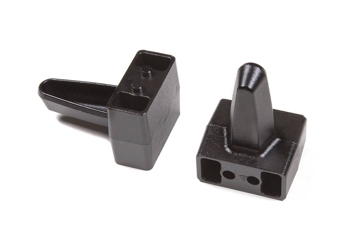 Upgrade your truck's rear suspension with these premium cast steel lift blocks. Designed specifically for leaf spring trucks, these 5" cast steel lift blocks raise the rear of the vehicle and include a bump stop wing to maintain proper suspension travel after installation. Finished in a black e-coating for durability and sold in pairs.