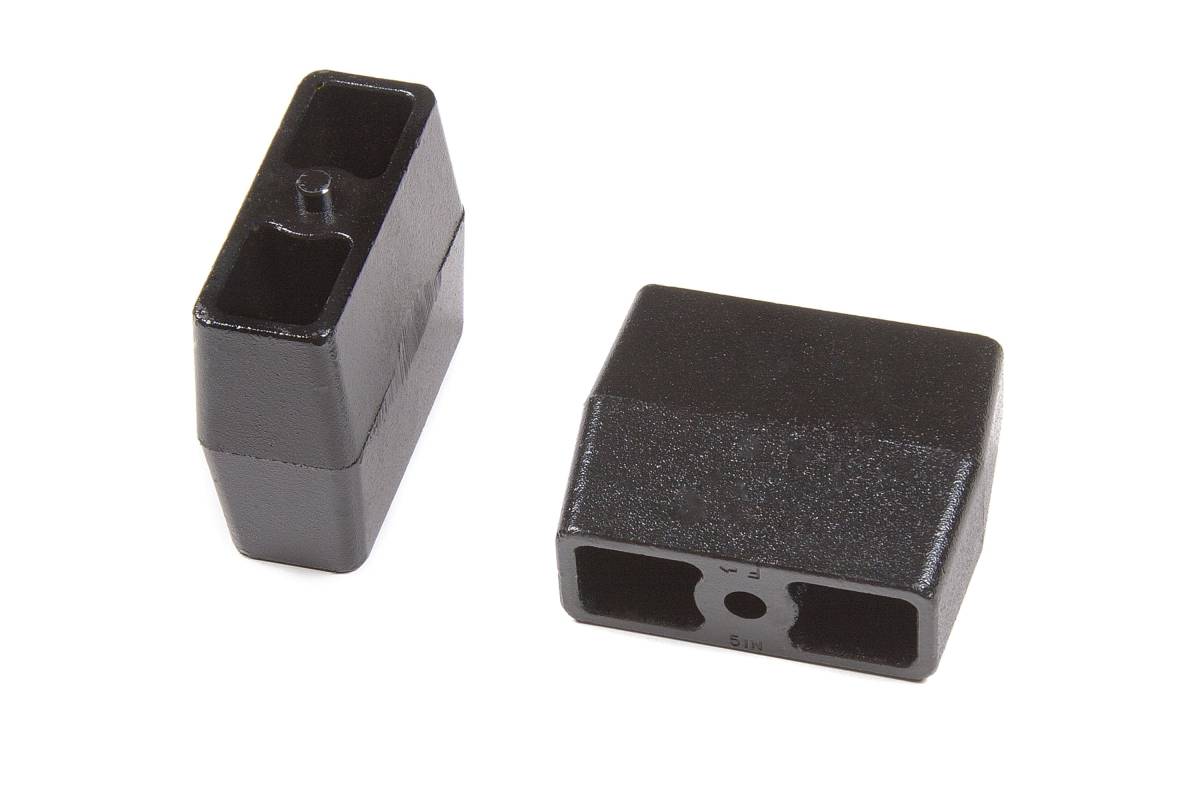 Upgrade your truck's rear suspension with premium cast iron lift blocks. These 5-inch cast iron lift blocks are designed to lift the rear of leaf spring trucks. They feature a flat design to help improve pinion angle once installed and come finished in a black e-coating. Uses a 5/8-inch pin size. Sold in pairs.