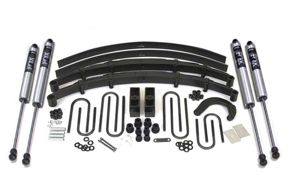 Rear lift is achieved using a 4 Inch Block Kit with Add-A-Leaf. The add-a-leaf helps eliminate axle wrap, provides a more controlled and stable feel, and maintains factory payload weight ratings without replacing the full rear spring pack. Paired with FOX 2.0 Performance Series shocks featuring a 2-inch impact extruded aluminum body, internal floating piston monotube design, CNC machined 6061-T6 aluminum mounting ends, a massive 5/8-inch hard chrome plated heat-treated alloy steel shaft, race-developed high-flow piston, and application-specific valving for maximum on- and off-road performance.
