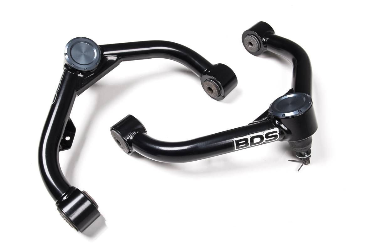 Increase wheel travel by upgrading the stock OE arms on your 2001–2010 Chevy Silverado or GMC Sierra 2500HD/3500HD to BDS performance upper control arms (UCA). Specially designed for leveled and lifted applications, these arms are built from high-strength 1.5-inch OD x .120-wall steel tubing and feature an indexed ball joint cup to correct ball joint positioning. Compatible with BDS 6.5-inch lift kits as well as other lift and leveling kits. The frame mounting ends feature durometer-specific rubber bushings and premium quality ball joints for smooth, quiet operation and superior durability compared to arms featuring uniballs, poly bushings, or heims.
