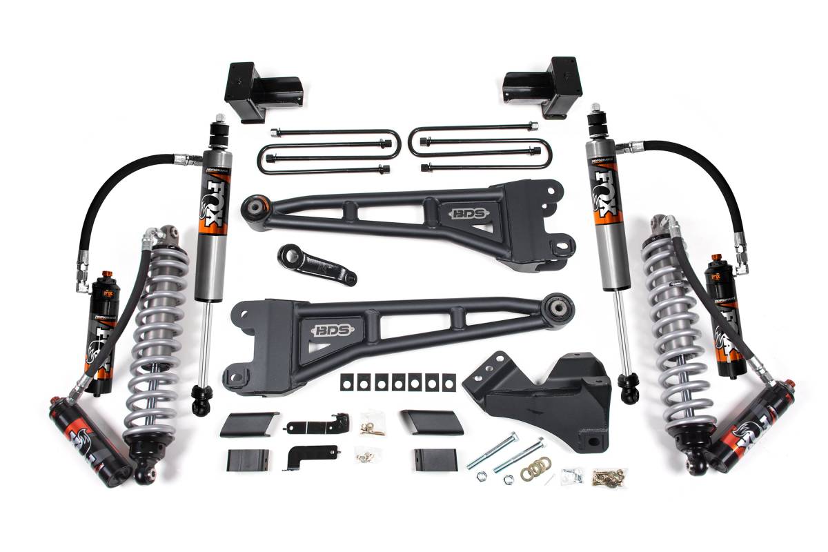 The BDS 4-inch Radius Arm Lift Kit is engineered for the 2023–2026 Ford F-450 Super Duty 4WD (diesel models only). Built around heavy-duty DOM steel radius arms, this kit prioritises durability, straightforward design, and long-term reliability — qualities well-suited to the demands of heavy-duty truck use including towing and hauling. The front end is upgraded with FOX 2.5 Performance Elite coilovers for responsive, comfortable performance on- and off-road. Steering geometry correction is addressed with a forged drop pitman arm and heavy-duty track bar drop bracket to keep suspension components in phase through travel.