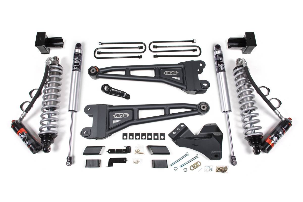 The BDS 4-inch Radius Arm Lift Kit is engineered for the 2023–2026 Ford F-450 Super Duty 4WD (diesel models only). Built around heavy-duty DOM steel radius arms, this kit prioritises durability, straightforward design, and long-term reliability — qualities well-suited to the demands of heavy-duty truck use including towing and hauling. The front end is upgraded with FOX 2.5 Performance Elite coilovers for responsive, comfortable performance on- and off-road. Steering geometry correction is addressed with a forged drop pitman arm and heavy-duty track bar drop bracket to keep suspension components in phase through travel.