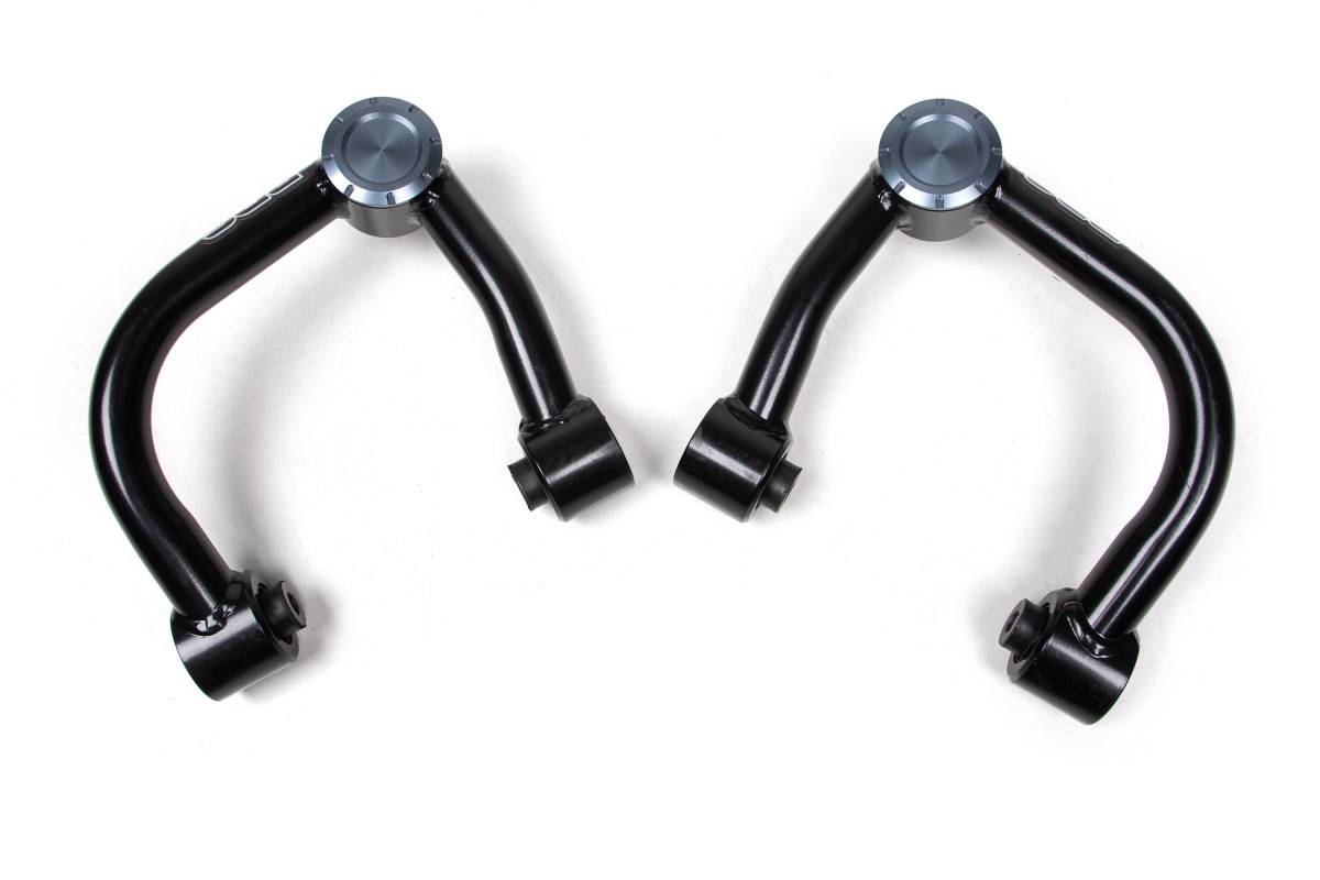 Upgrade the stock OE upper control arms on your 2021-2025 Ford Bronco with BDS performance upper control arms designed for leveled and lifted applications. Built from high-strength 1.5-inch OD x .120-wall steel tubing, these arms feature an indexed ball joint cup to correct ball joint positioning. Compatible with BDS lift kits as well as other lift and leveling kits on the market. The frame-mounted end uses durometer-specific vulcanized rubber bushings pre-installed for smooth, quiet, and reliable operation, bolting directly into the factory mounts. The outer mount utilizes FK uniball bearings for maximum strength, travel, and all-around performance. These UCAs add 1.5 degrees of caster correction to bring camber back within alignment spec on 2–4" of lift for base suspension Broncos and 1–3" of lift on Badlands/Sasquatch-equipped Broncos.