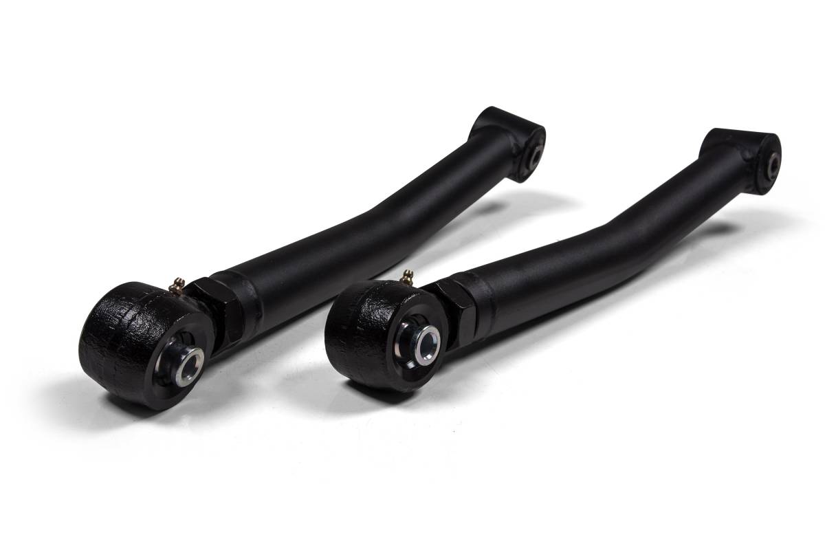 Upgrade the factory control arms on your 2018–2026 Jeep Wrangler JL with BDS heavy-duty rear lower replacements. Designed as a bolt-in upgrade, these control arms add strength and adjustability to stock or lifted vehicles. Built from thick-wall tubing and specially formed to maximize tire clearance, they feature an OE-style rubber bushing at the axle end for long, service-free operation and improved isolation of noise, vibration, and harshness (NVH). At the frame mount, a large forged flex end provides strength, durability, and off-road articulation. The forged flex ends allow length adjustments to correctly position the rear axle and correct caster, with 15 degrees of misalignment capability in either direction for enhanced trail flex.