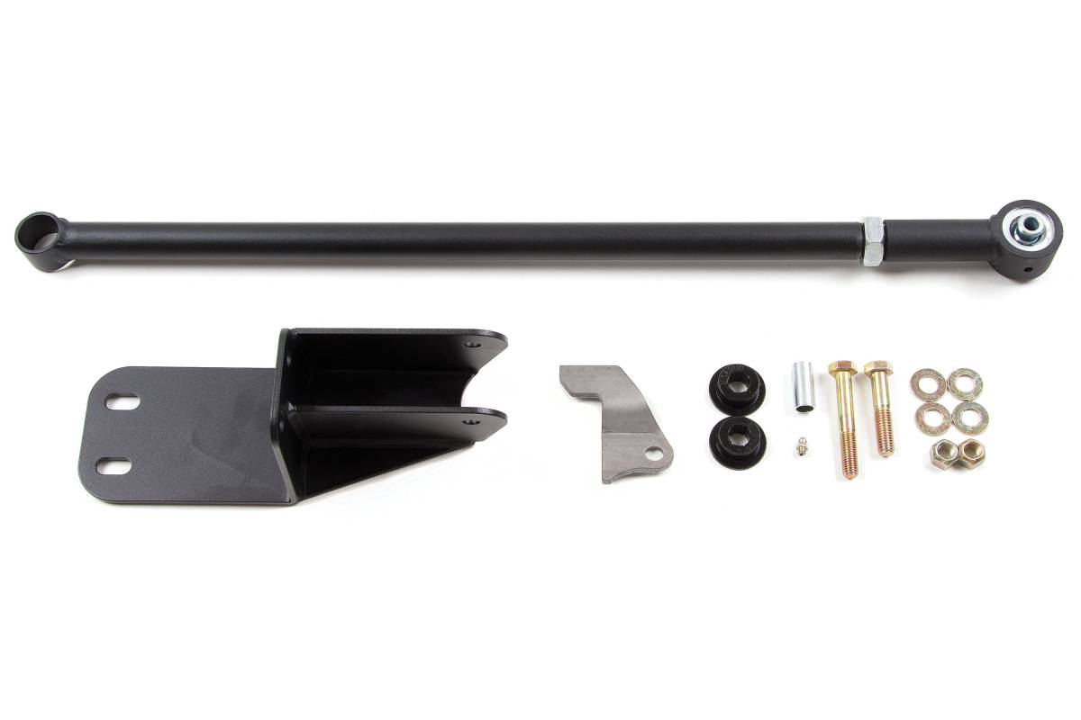 Replace the stock front track bar on your 1984–2001 Jeep Cherokee XJ or 1993–1998 Grand Cherokee ZJ with this heavy-duty BDS upgrade. Constructed from high-strength 5/16" x 1.5" OD tubular steel with a gusseted end and durometer-specific bushings, this track bar is designed for use with 6 to 9 inches of lift and is compatible with most kits on the market. A threaded double adjustment collar allows length changes while the bar remains installed on the vehicle, and a pinch bolt-style clamp locks the position once set. The bar is precision formed for clearance around critical front-end components and installs as a direct bolt-on replacement.