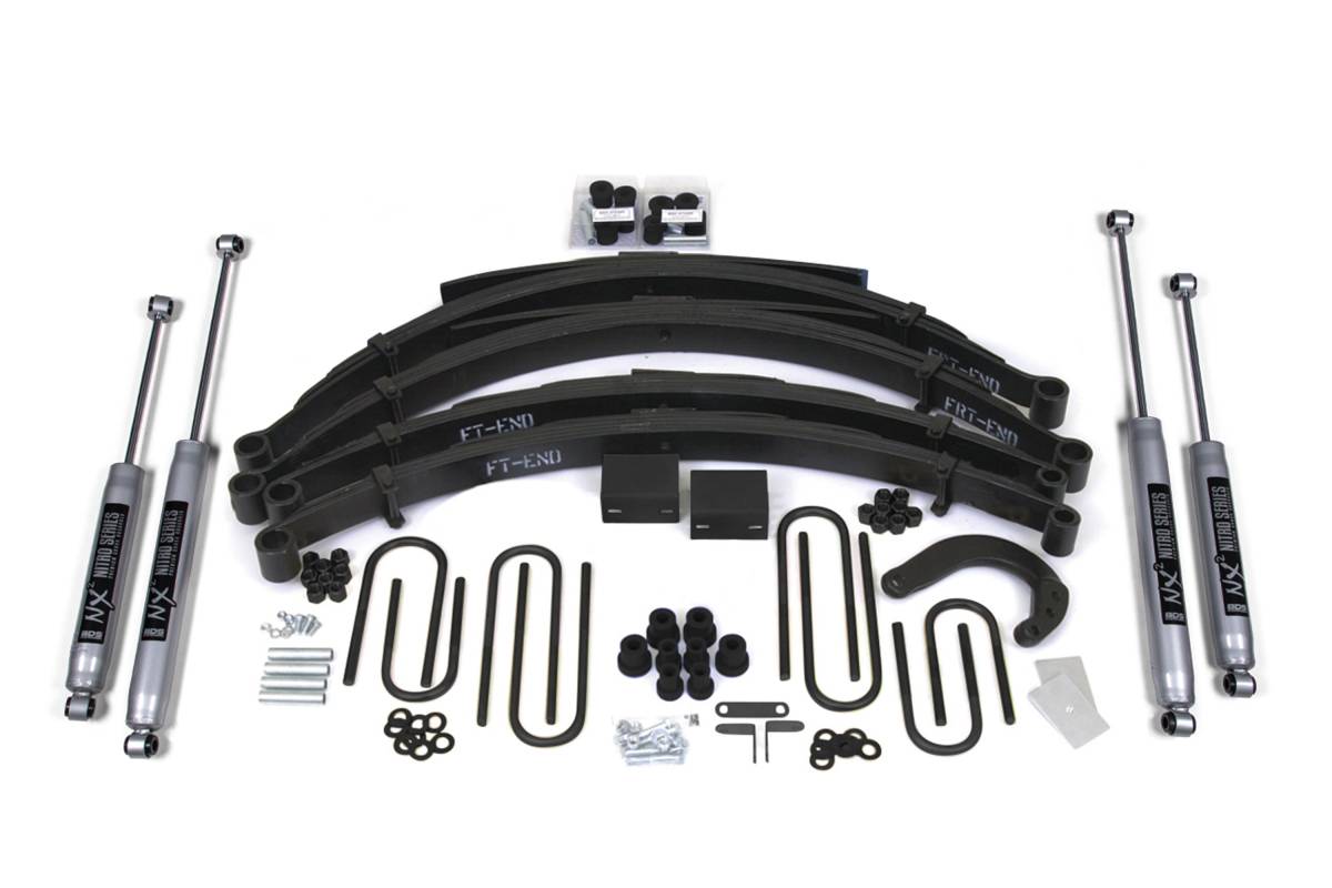 This 6-inch lift kit from BDS Suspension is designed to improve the stance, performance, and capability of 1977–1987 Chevy and GMC 1/2 ton trucks and SUVs, including the K5 Blazer, K10, and K15 (4WD). The kit includes everything necessary to complete the install and provides clearance for up to 35-inch tires. Up front, the kit features Glide-Ride leaf springs, a 4-inch steering arm for steering correction, brake line brackets, and precision-tuned shocks. The rear utilizes a high-strength lift block, longer U-bolts, and a matching set of shocks. Rear spring options and shock options are available to suit different build goals.