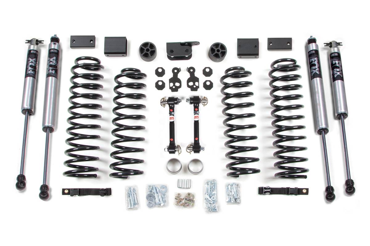This 3-inch coil spring lift kit from BDS Suspension is designed for the 2012-2018 Jeep Wrangler JK 4-Door. The kit improves stance and provides clearance for up to 35-inch tires. Up front, the kit includes 3-inch Pro-Ride coil springs capable of full coil bind, 2-inch bump stop extensions to control compression travel while increasing wheel travel, brake line brackets, alignment cams to fine-tune front caster angles, and sway bar links. In the rear, the kit utilizes Pro-Ride coil springs, sway bar drop brackets, and a rear frame-mounted track bar relocation bracket to correct axle shift. Pro-Ride coil springs are full-length, gas-specific, progressive-rate springs manufactured from high-tensile steel with properly sized wire diameters, engineered for maximum reliability without premature coil bind.