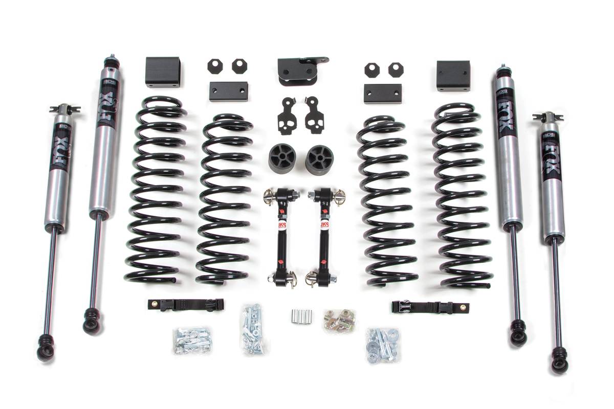 This 3-inch coil spring lift kit from BDS Suspension is designed for the 2007-2011 Jeep Wrangler JK 4-Door. The kit includes everything necessary to improve stance and provide clearance for up to 35-inch tires. Up front, the kit includes 3-inch Pro-Ride coil springs capable of full coil bind, 2-inch bump stop extensions to control compression travel while increasing wheel travel, brake line brackets, alignment cams to fine-tune front caster angles, and sway bar links. In the rear, the kit utilizes Pro-Ride coil springs, sway bar drop brackets, and a rear frame-mounted track bar relocation bracket to correct axle shift. Pro-Ride coil springs are full-length, gas-specific, progressive rate springs manufactured from high tensile steel. Engineered with properly sized wire diameter as direct OE replacements, they are designed for maximum reliability without premature coil bind.