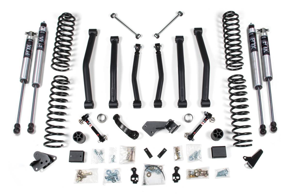 This 4-inch lift kit from BDS Suspension is designed for the 2012–2018 Jeep Wrangler JK 2-Door. The kit includes everything necessary to improve stance and provide clearance for up to 37-inch tires. Up front, the kit features 4-inch Pro-Ride coil springs capable of full coil bind and 3-inch bump stop extensions to control compression travel while increasing wheel travel. Also included are brake line brackets, sway bar links, a front track bar relocation bracket, and a pitman arm to improve steering and handling geometry. Fixed length lower control arms with OE-grade rubber bushings re-position the front axle for proper alignment. In the rear, the kit utilizes Pro-Ride coil springs, sway bar drop brackets, and a rear frame-mounted track bar relocation bracket to correct axle shift. Fixed length rear lower control arms and adjustable rear upper arms are included for proper rear axle position and pinion angle correction.