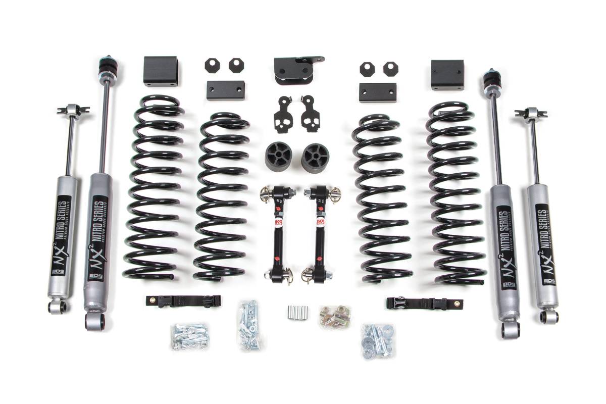 This 3-inch coil spring lift kit from BDS Suspension is designed for the 2007-2011 Jeep Wrangler JK 2-Door, improving stance and providing clearance for up to 35-inch tires. Up front, the kit includes 3-inch Pro-Ride coil springs capable of full coil bind and 2-inch bump stop extensions to control compression travel while increasing wheel travel. Also included are brake line brackets, alignment cams to fine-tune front caster angles, and sway bar links. In the rear, the kit utilizes Pro-Ride coil springs, sway bar drop brackets, and a rear frame-mounted track bar relocation bracket to correct axle shift. Pro-Ride coil springs are full-length, gas-specific, and progressive rate, manufactured from high tensile steel as direct OE replacements engineered with properly sized wire diameter for maximum reliability without premature coil bind.