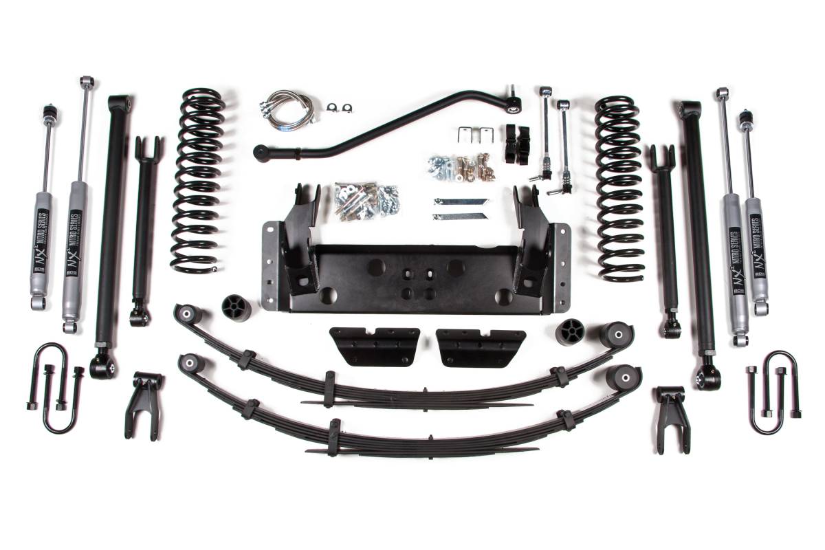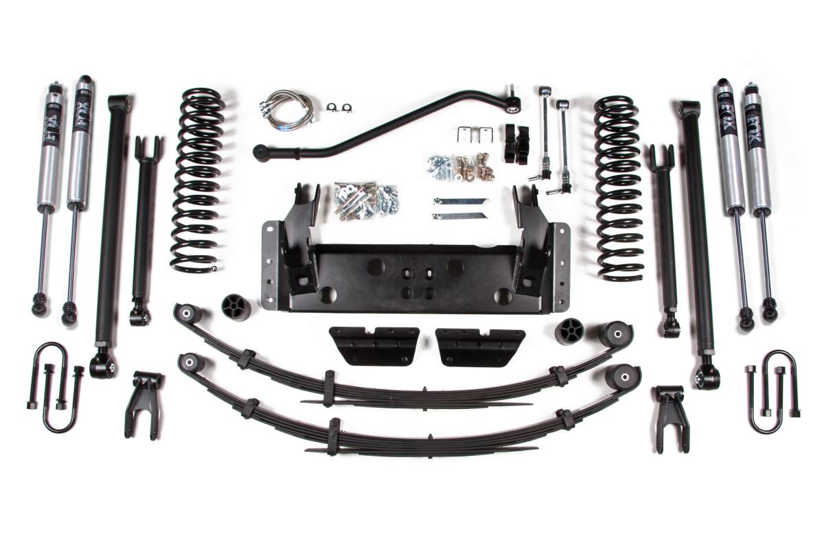 Up front, the kit includes a belly pan with new pivot mounts, heavy-duty lower flex arms, and adjustable upper flex arms, along with 4.5-inch Pro-Ride coil springs capable of full coil bind, bump stop extensions, braided stainless steel brake lines, ultimate sway bar disconnects, and a front adjustable track bar with flex joint that fits into the existing frame mount. The rear kit uses Glide-Ride leaf springs for maximum travel and a stainless braided brake line.