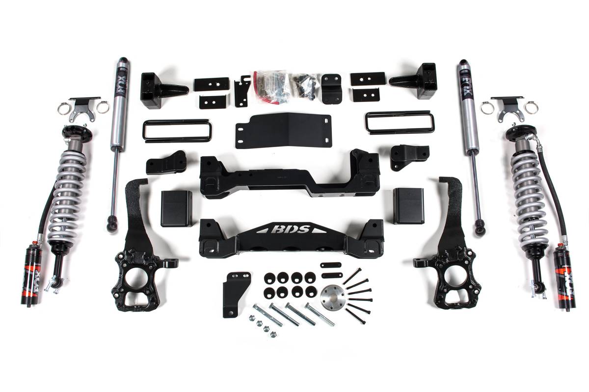These 6-inch coil-over suspension lift kits are engineered for the 2015–2020 Ford F150 4WD. They feature proprietary FOX Performance Elite 2.5 coil-over shocks designed specifically to bolt on to the F150, providing increased travel and the ability to absorb rough terrain while maintaining smooth on-road comfort. The kit includes all components necessary to achieve clearance for up to 37-inch tires. BDS's high-clearance design improves ground clearance, strength, and off-road protection while correcting suspension and steering geometry for proper on-road handling.