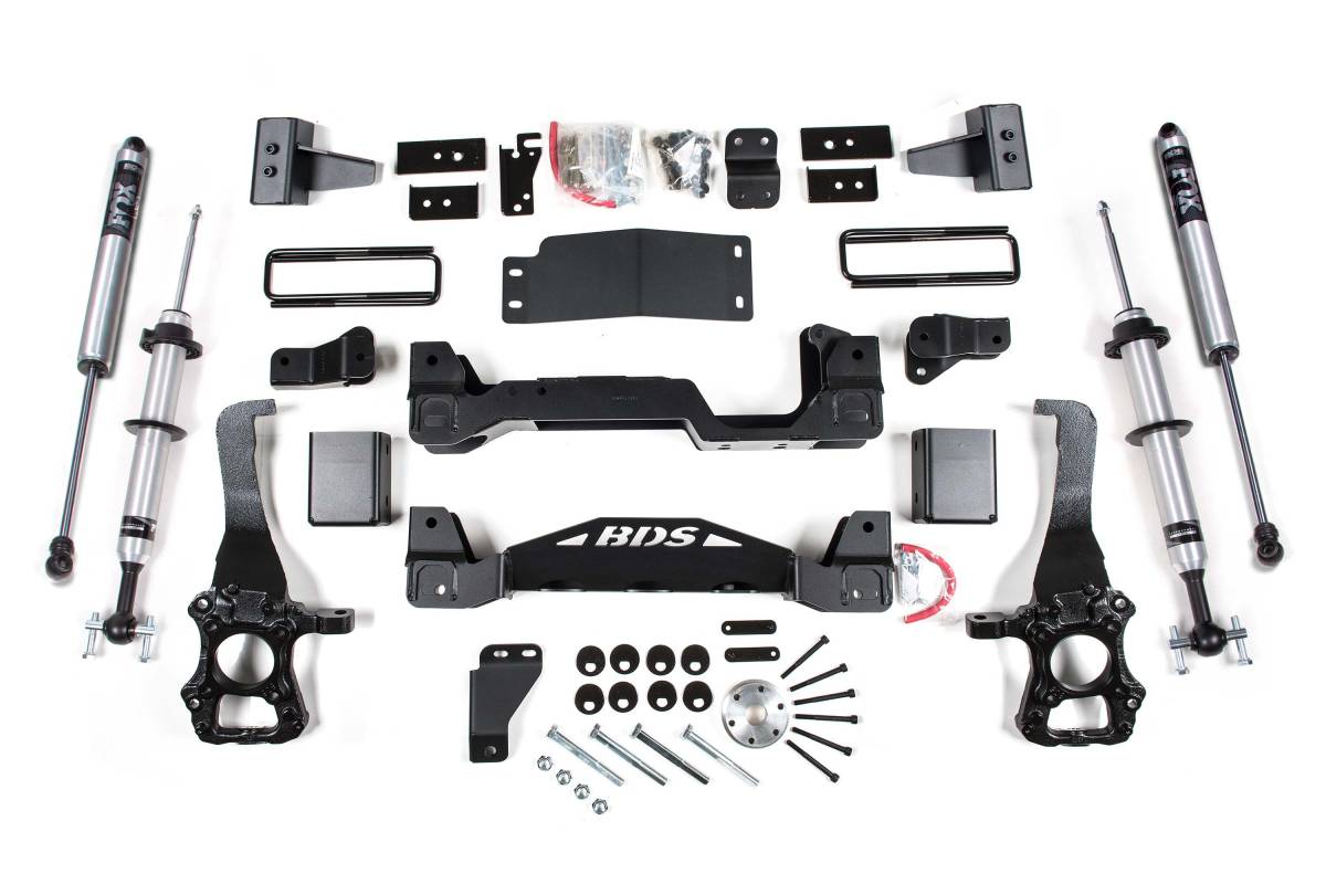 This BDS Suspension 4-inch lift kit with FOX 2.0 Performance Series struts is designed for 2015–2020 Ford F150 4WD trucks. The kit provides clearance for up to 35-inch tires and takes advantage of BDS's high-clearance design to improve ground clearance, strength, and off-road protection while correcting suspension and steering geometry for on-road handling. Up front, the kit utilizes FOX 2.0 coil-over struts, high-arched 1/4-inch thick steel crossmembers, multi-piece differential relocation brackets, and a skid plate. Steering geometry is corrected at the new ride height with CNC-machined ductile iron steering knuckles. Sway bar relocation brackets, brake line brackets, alignment cam bolts, and all required hardware are included. The rear uses high-strength fabricated lift blocks and longer U-bolts to lift and level the stance.
