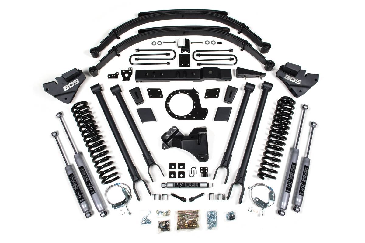 This 8-inch 4-Link lift kit from BDS Suspension is designed for 2017–2019 Ford F250 and F350 Super Duty diesel trucks. The kit is engineered to improve stance, performance, and capability, providing clearance for up to 40-inch tires. Up front, the kit includes diesel-specific Pro-Ride coil springs, a 4-Link control arm conversion, a forged drop pitman arm, a track bar bracket for steering correction, sway bar relocation brackets, brake line brackets, and custom-tuned nitrogen charged shocks. A transfer case indexing ring and new transmission crossmember are supplied to allow use of the factory front driveshaft at this lift height. The rear of the kit utilizes full replacement BDS Glideride leaf springs, u-bolts, brake line brackets, and a matched set of shocks.