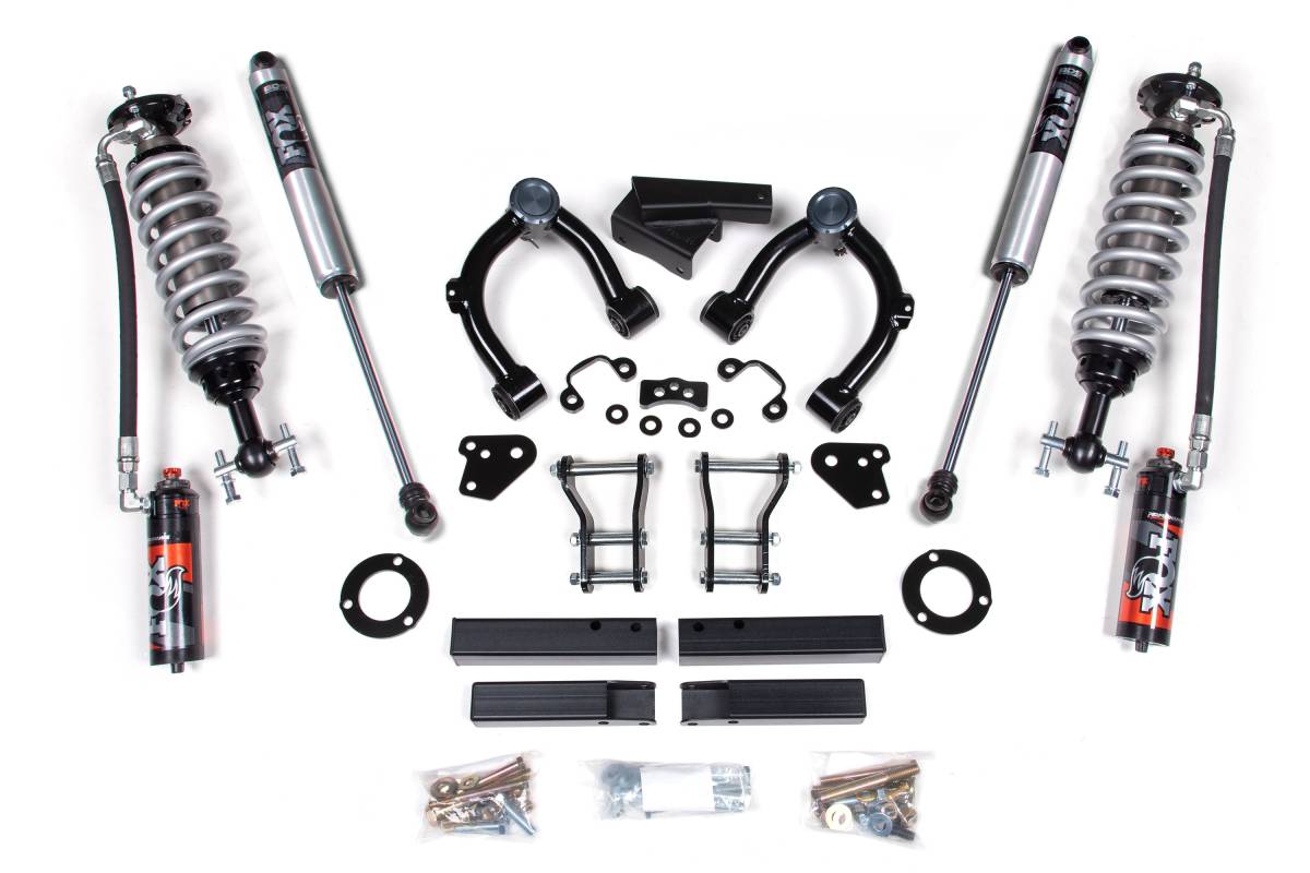 - Front: FOX 2.5 coil-over shocks, top mount strut spacers, pre-load spacers, differential relocation brackets, tubular upper control arms
