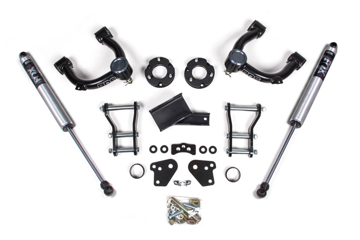 Configured for trucks equipped with Cast Aluminum knuckles and includes FOX 2.0 Performance Series rear shocks. FOX 2.0 shocks feature a 2-inch impact extruded aluminum body, internal floating piston (IFP) monotube design, CNC machined 6061-T6 aluminum mounting ends, a massive 5/8-inch hard chrome plated heat-treated alloy steel shaft, race-developed high-flow piston design, application-specific valving, and a long-lasting clear anodized finish.