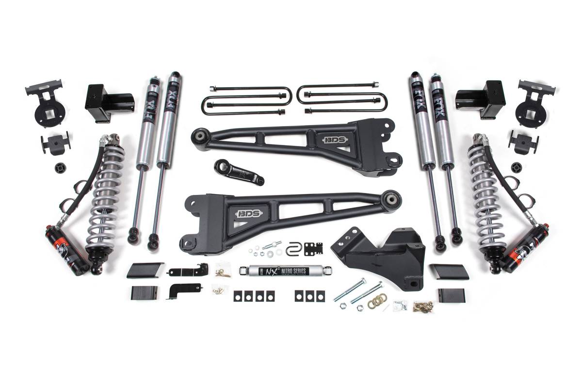 This 5-inch radius arm lift kit with FOX coil-over conversion from BDS Suspension is designed to improve the stance, performance, and capability of 2020–2022 Ford F-250/F-350 Super Duty diesel-powered 4WD trucks. The kit provides clearance for up to 37-inch tires and includes everything necessary for a complete installation. Up front, the kit includes diesel-specific FOX coil-over shocks, heavy-duty replacement radius arms, a forged drop pitman arm, a track bar bracket for steering correction, sway bar relocation hardware, and brake line brackets. In the rear, the kit utilizes a high-strength fabricated lift block, longer U-bolts, brake line brackets, and a matching set of FOX Performance shocks. Fits SRW models only.