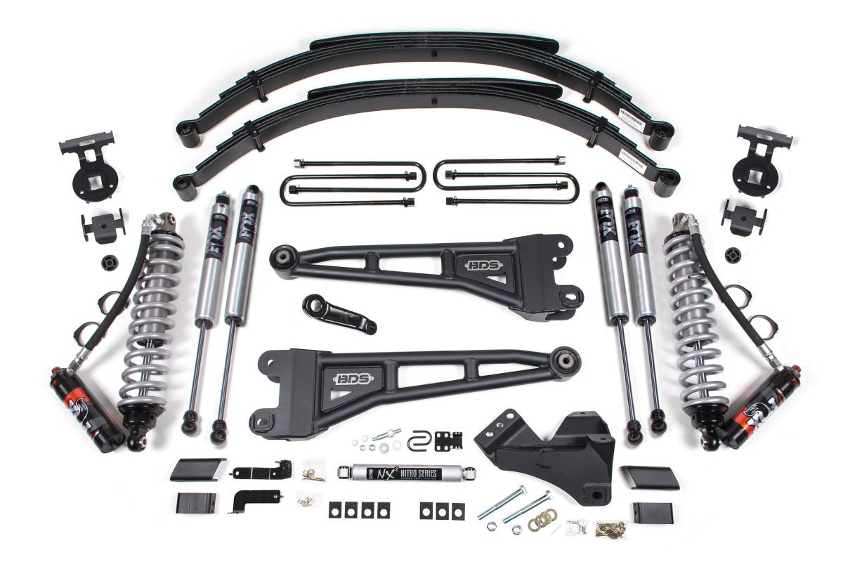 This 4-inch radius arm lift kit with FOX 2.5 Performance Elite coil-over conversion is designed for 2017–2019 Ford F250 and F350 Super Duty diesel-powered trucks (4WD, SRW). The kit is built to improve stance, performance, and capability, providing clearance for up to 37-inch tires. Up front, the kit includes diesel-specific FOX 2.5 coil-over shocks, heavy-duty replacement radius arms, a forged drop pitman arm, a track bar bracket for steering correction, sway bar relocation, and brake line brackets. In the rear, the kit utilizes a high-strength fabricated lift block or leaf spring option (depending on variant), longer U-bolts, brake line brackets, and a matching set of FOX Performance rear shocks.