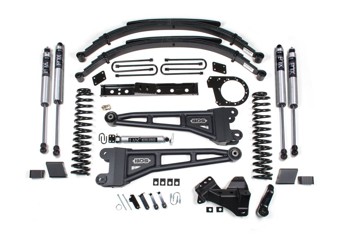 This 7-inch radius arm lift kit from BDS Suspension is designed for 2020–2022 Ford F-250/F-350 Super Duty diesel trucks (4WD, SRW). The kit provides clearance for up to 38-inch tires and includes everything needed for a complete front and rear lift. Up front, the kit includes diesel-specific Pro-Ride coil springs, heavy-duty tubular replacement radius arms, a forged drop pitman arm, a track bar bracket for steering correction, sway bar relocation hardware, brake line brackets, and custom-tuned nitrogen-charged shocks. A transfer case indexing ring featuring ARP studs and a new high-clearance transmission crossmember are supplied to allow use of the factory front driveshaft at this lift height. The rear of the truck is lifted using either a fabricated steel block kit or replacement leaf springs, depending on the configuration selected, along with longer U-bolts, brake line brackets, and a matched set of rear shocks.