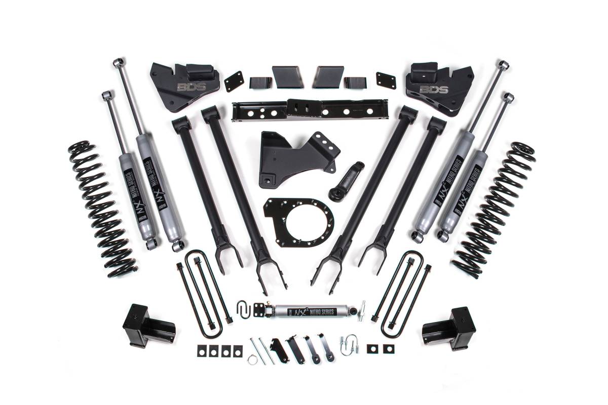 This 7-inch 4-Link lift kit from BDS Suspension is designed for 2020–2022 Ford F250/F350 Super Duty 4WD diesel trucks. The kit provides clearance for up to 38-inch tires and includes all components necessary for a complete installation. Up front, the kit features diesel-specific Pro-Ride coil springs, a 4-Link control arm conversion, a forged drop pitman arm, a track bar bracket for steering correction, sway bar relocation hardware, brake line brackets, and custom-tuned nitrogen charged shocks. A transfer case indexing ring and new transmission crossmember are supplied to allow use of the factory front driveshaft at this lift height. In the rear, the kit utilizes a high-strength fabricated lift block, longer U-bolts, brake line brackets, and a matched set of shocks.