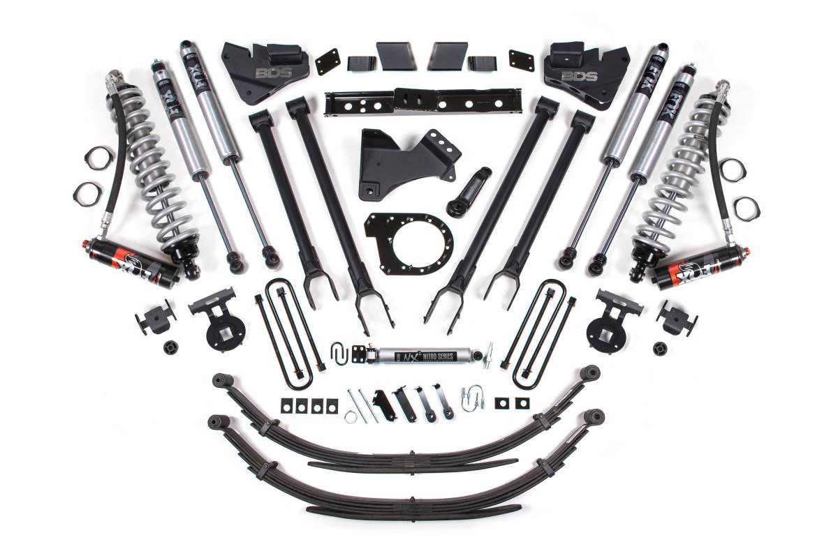 This 7-inch 4-Link lift kit with FOX 2.5 Performance Elite coil-over conversion is designed for 2020–2022 Ford F-250/F-350 Super Duty 4WD diesel trucks (SRW models only). The kit provides clearance for up to 38-inch tires and includes all components necessary for a complete front and rear lift. Up front, the kit features FOX 2.5 coil-over shocks with mounting brackets, a 4-Link control arm conversion, forged drop pitman arm, track bar bracket for steering correction, sway bar relocation, and brake line brackets. A transfer case indexing ring and new transmission crossmember are included to allow use of the factory front driveshaft at this lift height. The rear utilizes a high-strength fabricated lift option (block kit or leaf springs depending on variant), longer U-bolts, brake line brackets, and FOX Performance rear shocks.