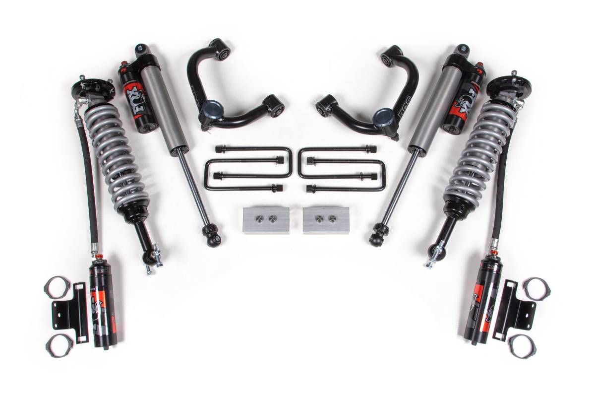 This 3-inch lift kit from BDS Suspension is designed for 2014–2020 Ford F150 4WD trucks, improving stance, performance, and capability while providing clearance for up to 35-inch tires. Up front, the kit includes FOX 2.5 Performance Elite Series remote reservoir coil-over shocks and heavy duty tubular upper control arms for increased strength. The rear of the kit uses a complementary set of FOX shocks (see variant options) for a smooth ride.