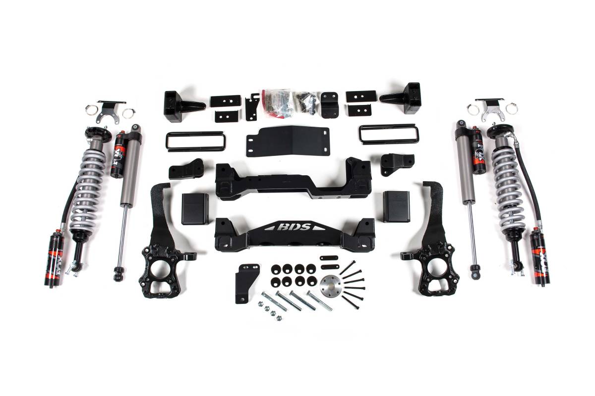 These 4-inch coil-over suspension lift kits are engineered for the 2015–2020 Ford F150 4WD and provide clearance for up to 35-inch tires. The kit takes advantage of BDS's high-clearance design for improved ground clearance, strength, and off-road protection while correcting suspension and steering geometry for on-road handling. Up front, the kit utilizes FOX 2.5 remote reservoir coil-over shocks, high-arched 1/4-inch thick steel crossmembers, multipiece differential relocation brackets, and a skid plate designed for off-road protection. Steering geometry is corrected at the new taller ride height with a pair of CNC-machined ductile iron steering knuckles, sway bar relocation brackets, brake line brackets, and alignment cam bolts. In the rear, high-strength fabricated lift blocks and longer U-bolts lift and level the stance, paired with FOX rear shocks.