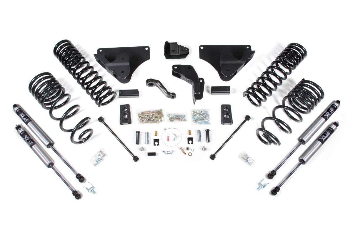 This 4-inch lift kit from BDS Suspension is designed for 2014–2018 RAM 2500 diesel-powered 4WD trucks. The kit improves stance, performance, and capability while providing clearance for up to 35-inch tires. Up front, the kit includes diesel-specific Pro-Ride coil springs, radius arm drop brackets, a forged drop pitman arm, a track bar bracket for steering correction, bump stops, and brake line brackets. In the rear, the kit utilizes progressive rate Pro-Ride coil springs (or coil spacers, depending on configuration), a track bar relocation bracket, bump stop extensions, sway bar links, and matching shocks. Pro-Ride coil springs are full-length, diesel-specific, and manufactured from high tensile steel as direct OE replacements engineered with properly sized wire diameter for maximum reliability without premature coil bind. A forged drop pitman arm minimizes steering angle, and a heavy duty track bar drop bracket keeps steering geometry in phase through suspension travel while recentering the front axle.