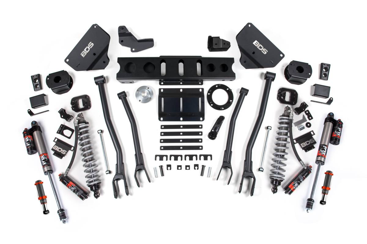The BDS 6 Inch 4-Link Lift Kit for RAM 2500 trucks replaces the stock suspension setup with heavy-duty hardware designed for demanding off-road use. At the core of the kit are BDS 4-Link arms, engineered for improved articulation and rugged strength. Up front, the BDS Coilover Conversion Kit pairs with FOX Performance Elite coilovers for enhanced damping control and ride quality on and off the road. Out back, FOX Performance Elite shocks maintain control over varied terrain. An optional FOX 2.0 Hydraulic Bump Stop upgrade is available for the front to provide additional impact absorption under hard use.