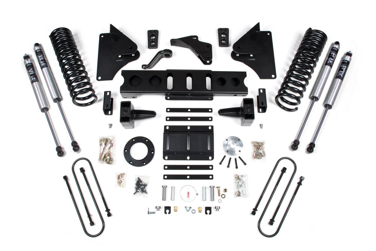 This 5.5-inch lift kit from BDS Suspension is designed for 2013–2018 RAM 3500 gas-powered 4WD trucks. The kit improves stance, performance, and capability while providing clearance for tires up to 37 inches. Up front, it includes gas-specific Pro-Ride coil springs, radius arm drop brackets, a forged drop pitman arm, a track bar bracket for steering correction, bump stops, brake line brackets, and precision-tuned shocks. In the rear, the kit is available with a high-strength fabricated lift block or leaf springs, longer u-bolts, and a matched set of shocks.